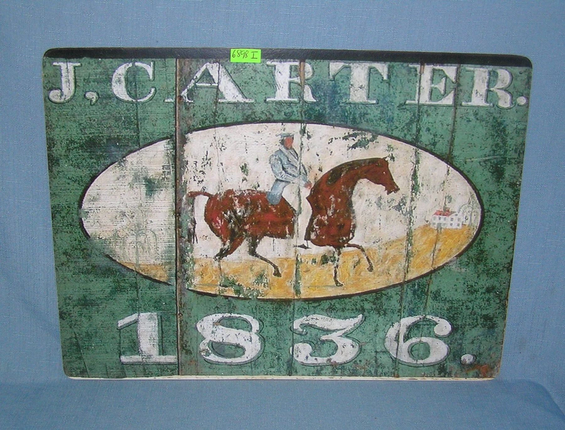 J. Carter 1836 Horseman retro style advertising sign printed on PVC hardboard these signs are auctioned for their decorative and display purposes 12 inches by 16 inches est. value $50.00-$60.00