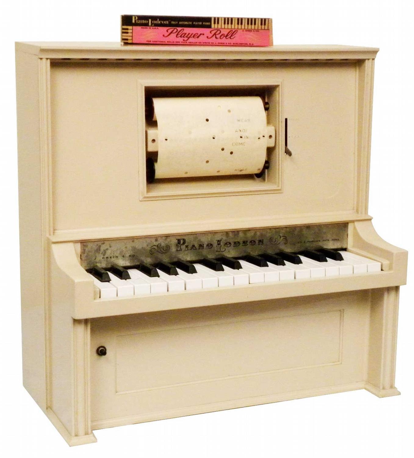 Miniature Piano Lodean "Fully Automatic Player Piano" , J. Chein & Co. Burlington, N.J. Comes with additional roll in original box. 18 1/4 X 18 X 10 1/2 inches.