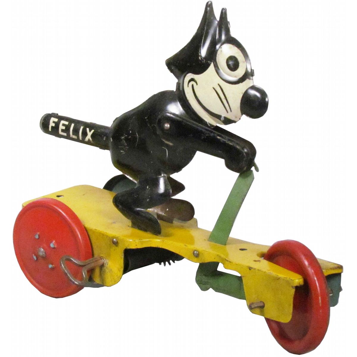 J. Chein Felix Scooter Tin Toy. Made for George Borgfeldt's American Line of toys. This Felix bear no company logo. Very good condition. 7 1/2 inches long.