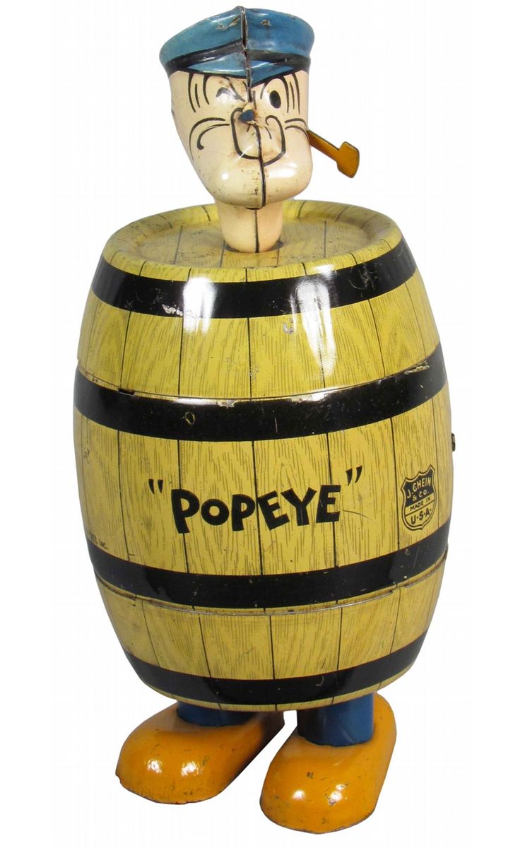 J. Chein Popeye Barrel Walker Tin Wind Up Toy, No. 258. Excellent condition. 7 inches tall.
