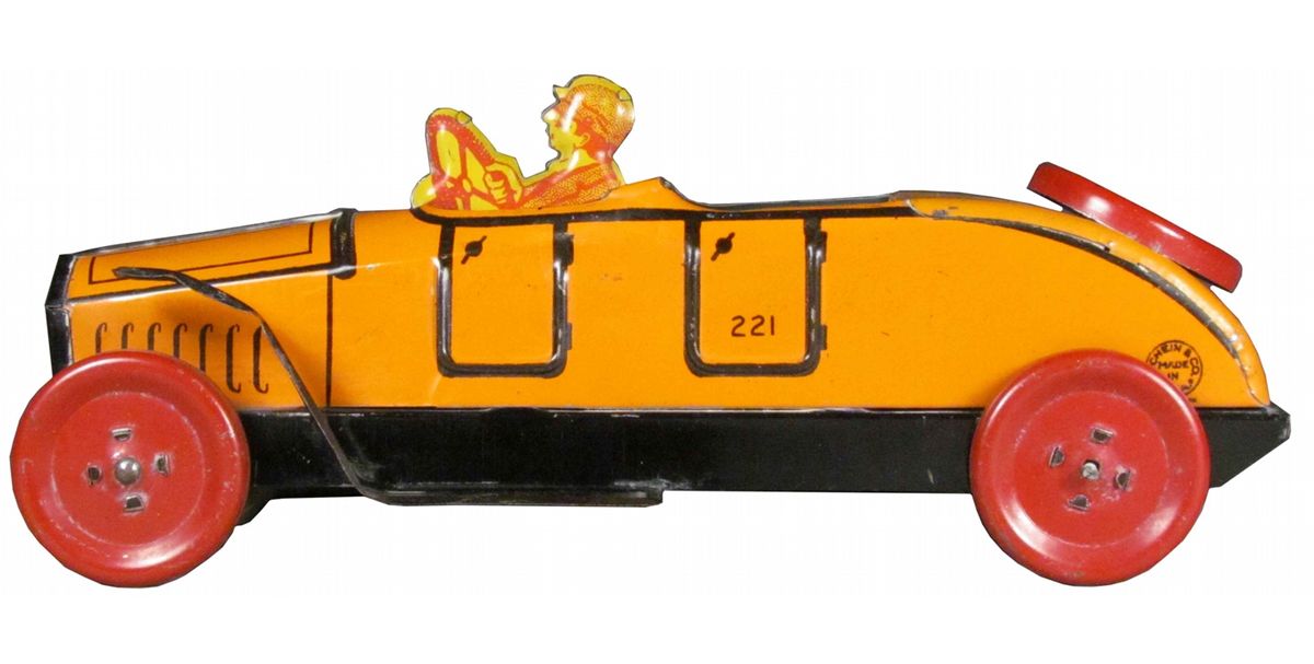 J. Chein Tin Toy # 221 Roadster, late 1920's. Some very light scratches otherwise very good condition. 8 1/2 inches long.