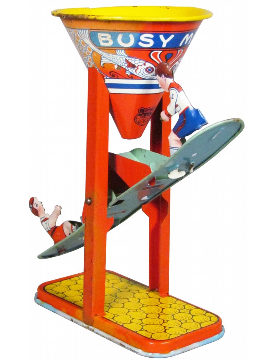 J. Chein Tin Toy # 75"Busy Mike" See Saw, 1930. One side faded and very slight rust at top rim otherwise good condition. 7 1/2 X 7 X 2 1/2 inches.