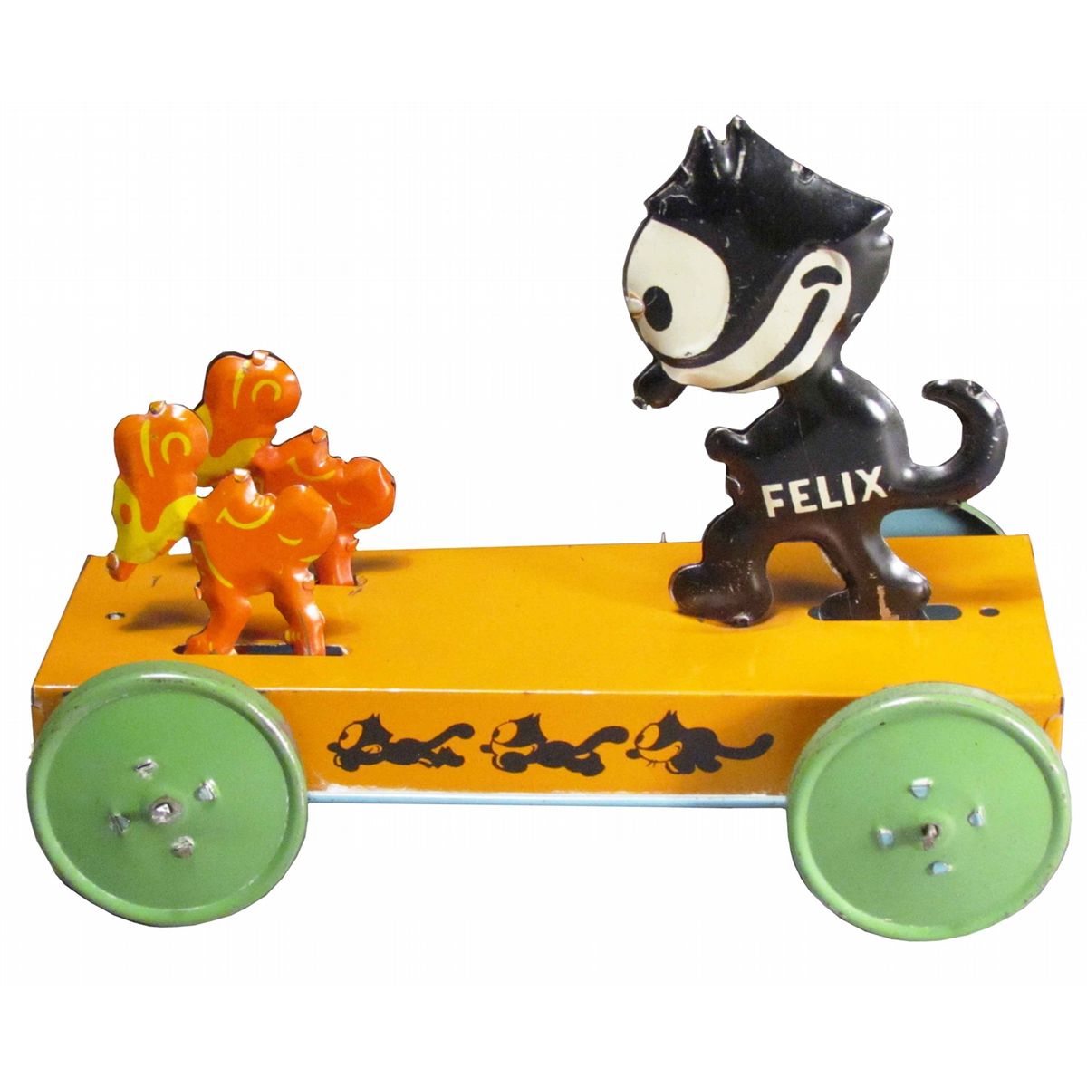 J. Chein Tin Toy, Felix Chasing Mice. Produced for George Borgfeldt's Nifty line. Some very minor play wear on wheels otherwise excellent condition. 3 3/4 X 6 X 7 3/4 inches.