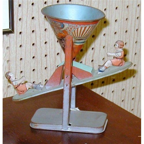 Great "Busy Mix" tin Sand toy by J. Chien Chein.  2 girls on seesaw in red and green.  It has rust and smudges.  Buyer pays shipping and handling costs.