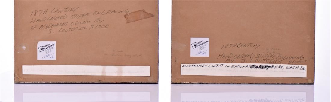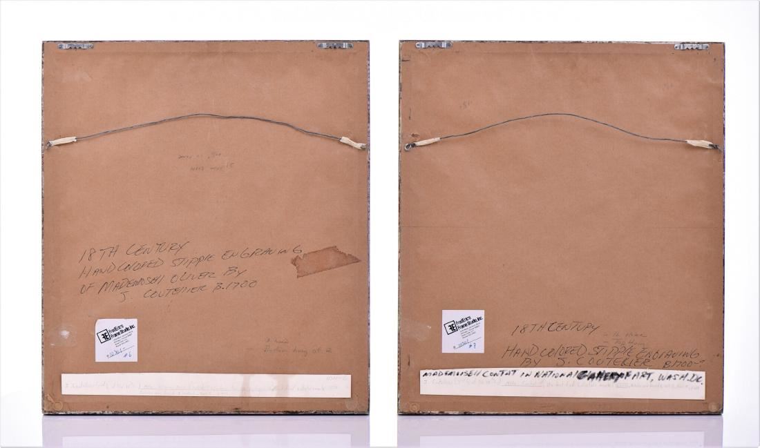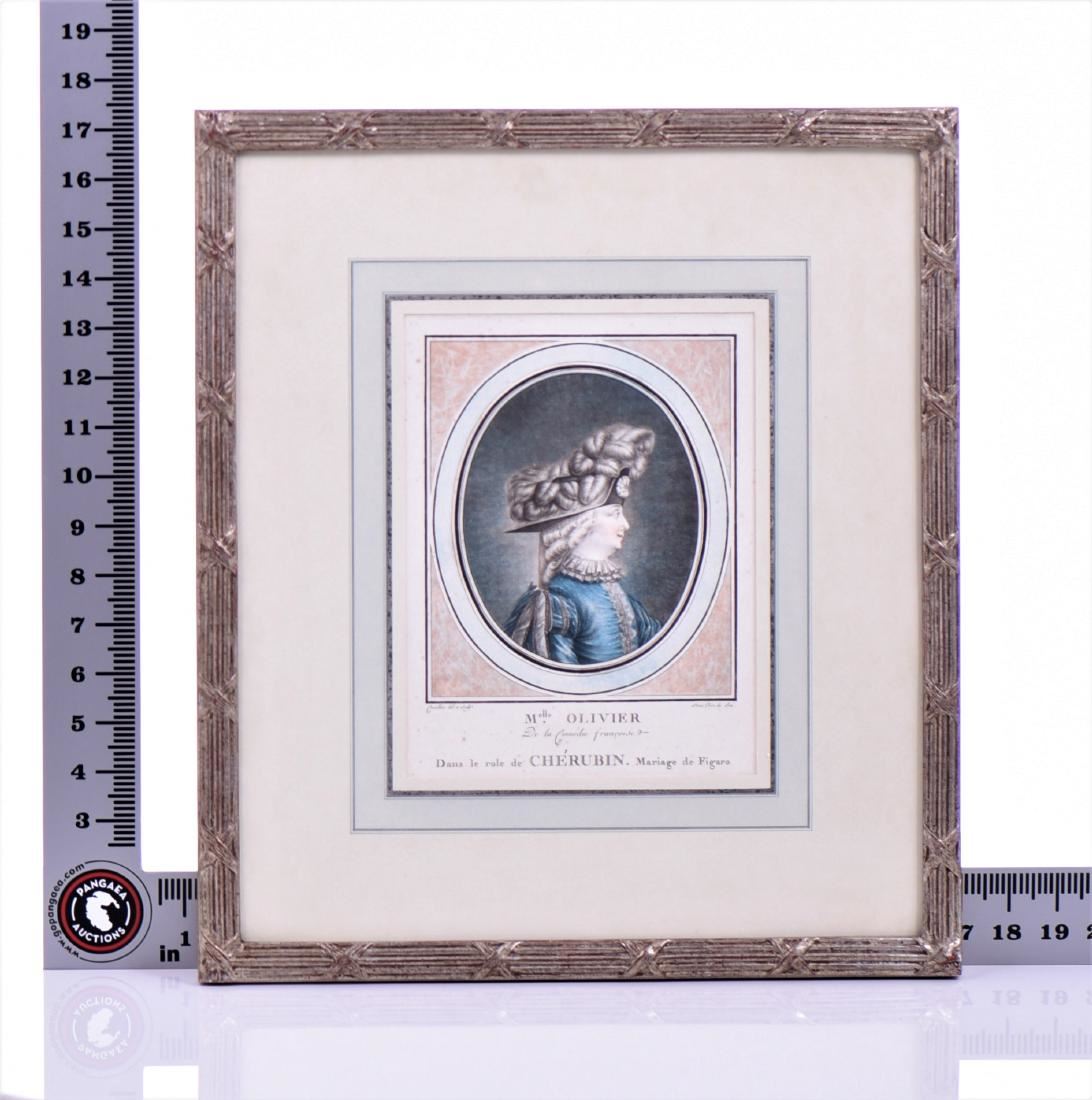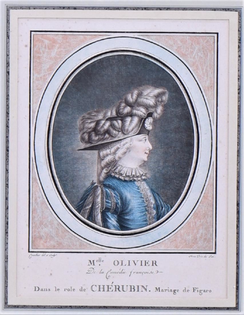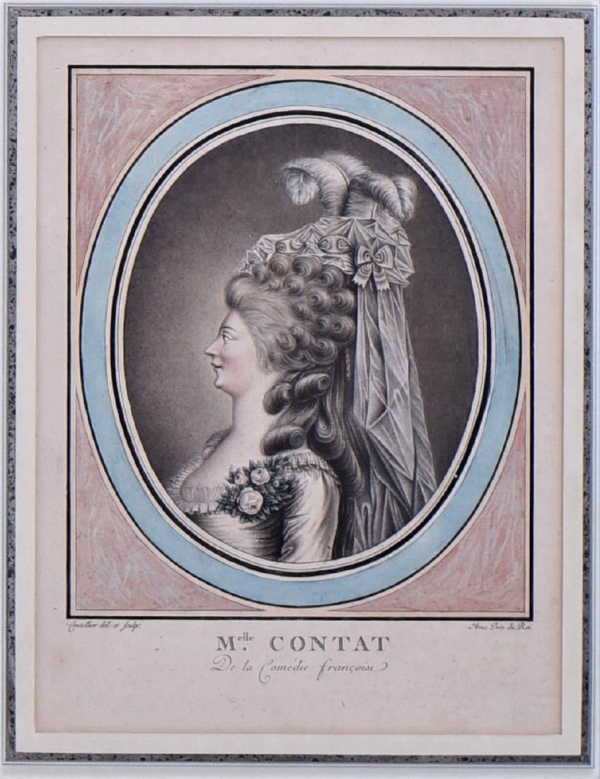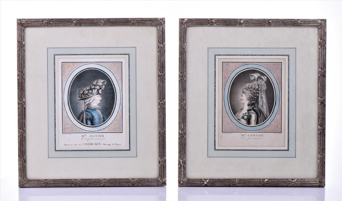 J. Coutellier Born 1700, Two Hand colored stipple engravings, Ca.1775. French draughtsman and engraver in Paris during the second half of the 18th century Mademoiselle Ollivier and Mademoiselle Contat. Hand colored matting. These same images are in the