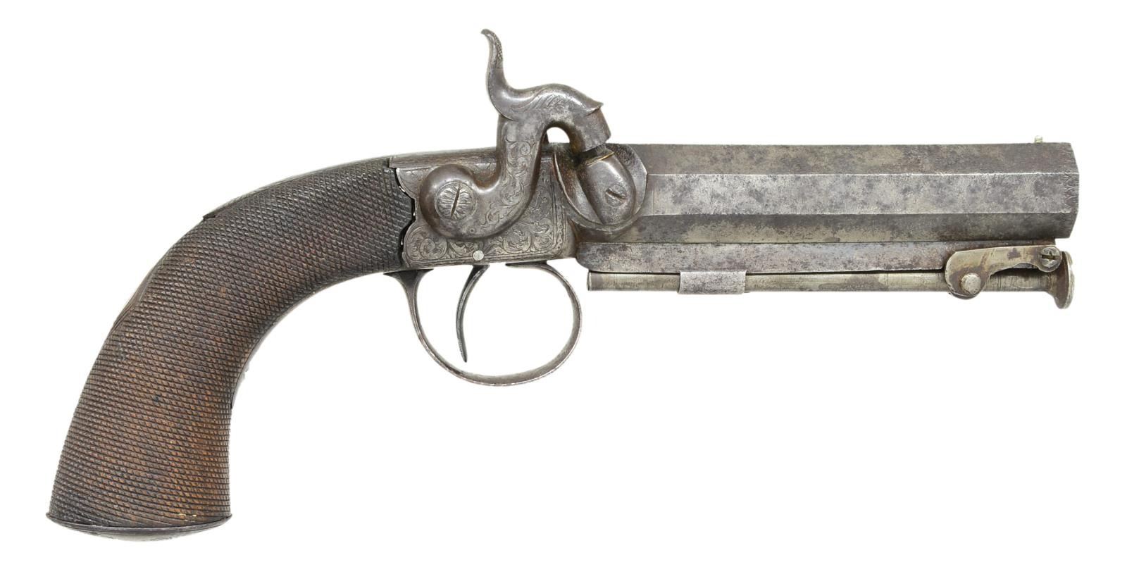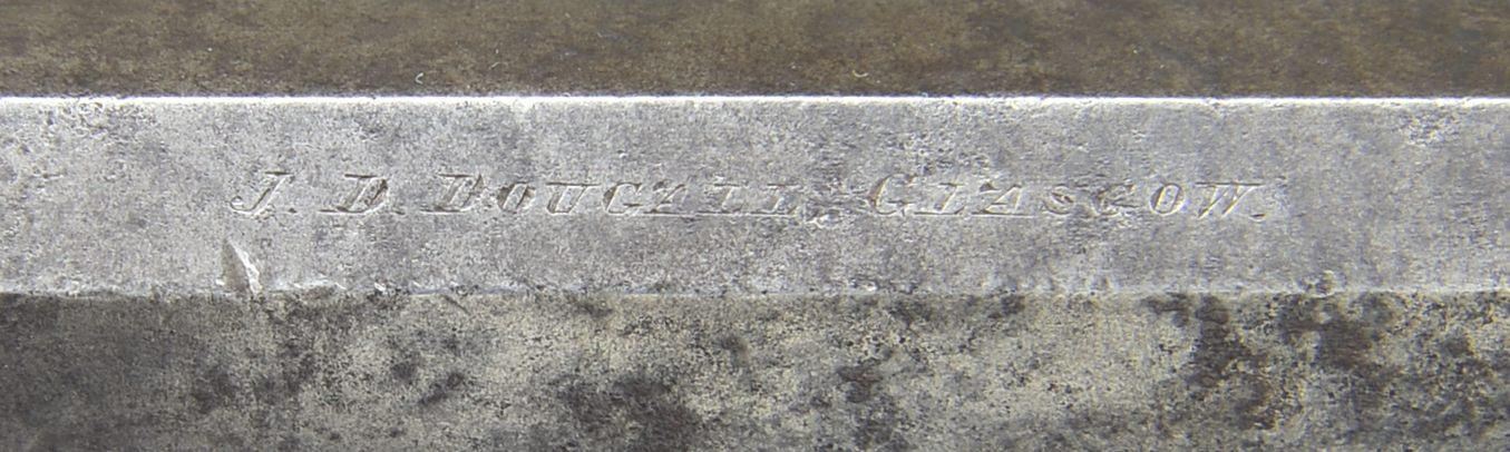 Cal. 54. NSN. Bbl. 4 1/4" oct. w/ smooth bore. Top flat marked "J. D. DOUGALL GLASGOW". Boxlock action w/ right side hammer & left side mounted belt clip. Action has fine foliate scroll hand engraving. Button tipped iron swivel ramrod held on iron under by single plain pipe. 1 Piece checkered pistol grip w/ steel trapdoor butt cap having German silver oval name plate on wrist. CONDITION: metal has faded to gray showing scattered light pitting. Grip show light wear w/ handling marks. Sound action. Bore shows scattered spots of pitting. (01-19160/DS). ANTIQUE. $300-500.