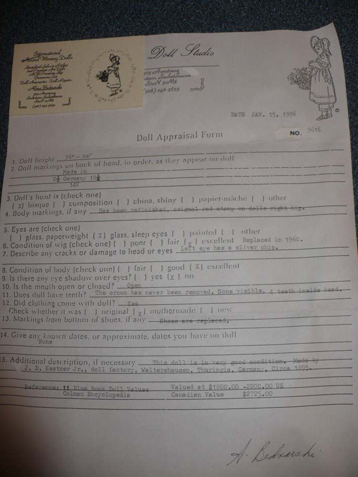 Doll appraisal form with doll 1996 value Cdn $2725.00