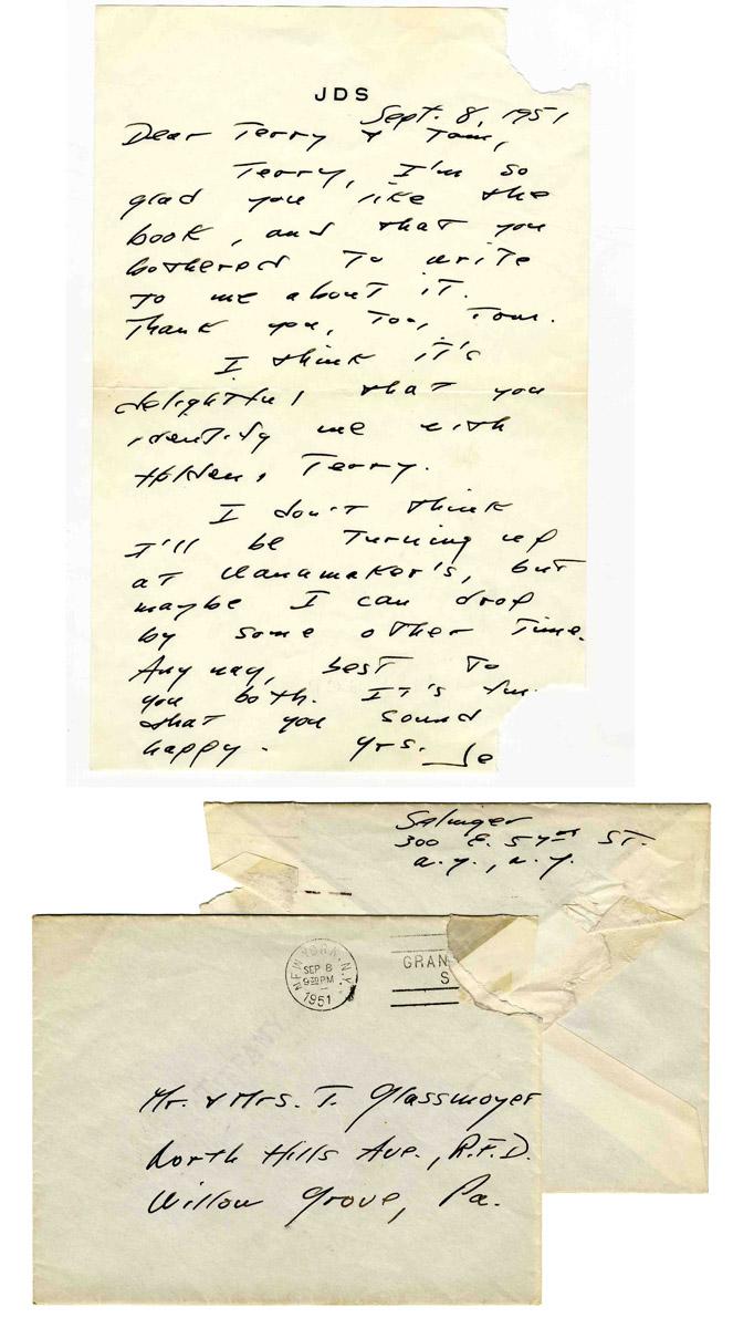 Amazing J.D. Salinger autograph letter signed dated 8 September 1951 thanking Frances (Terry) Thierolf and her husband Tom for their positive review of his new novel “Catcher in the Rye.” Thierolf was a former Ursinus College classmate of Salinger and inspiration for his literary character Franny Glass in ''Franny & Zooey.'' Written when he was 32, shortly after the publication of ''Catcher in the Rye.'' In full, “Dear Terry & Tom, Terry, I’m so glad you like the book – and that you bothered to write to me about it. Thank you, too, Tom. I think it’s delightful that you identify me with Holden, Terry. I don’t think I’ll be turning up at Wanamaker’s, but maybe I can drop by some other time. Any way, best to you both. It’s fi[ne] that you sound happy. Yrs, Je[rry].” Includes original New York stamped 6” x 4.5” envelope dated 8 September 1951 with back flap signed in pen “Salinger / 300 E. 57th St. / N.Y., N.Y.” Envelope was addressed by Salinger to “Mr. & Mrs. T. Glassmoyer / North Hills Ave., R.F.D. / Willow Grove, Pa.” Overall very good condition. Single page letter on JDS stationery measures 5.75” x 8.75” and has torn upper right and lower right corner eliminating two letters of a word and the “rry” in Salinger’s signature. Incredibly scarce handwritten item connecting Salinger to his famous protaganist Holden.