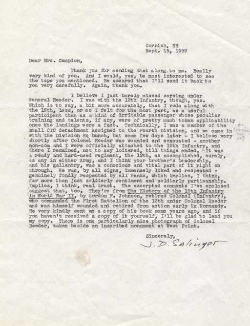 Rare typed letter signed ''J.D. Salinger'', dated 15 September 1989 from his home in Cornish, New Hampshire. Salinger writes to Nardi Reeder Campion, the sister of a soldier with whom Salinger served during WWII in the midst of writing ''Catcher in the Rye.'' With original typed envelope. In part, ''Thank you for sending that along to me. Really very kind of you. And I would, yes, be most interested to see the tape you mentioned. Be assured that I'll send it back to you very carefully. Again, thank you. I believe I just missed serving under General Reeder. I was with the 12th Infantry, though, yes. Which is to say, a bit more accurately, that I rode along with the 12th, less, or so I felt for the most part, as a useful participant than as a kind of irritable passenger whose peculiar training and talents, if any, were of pretty much token applicability once the landings were a fact. Technically, I was a member of the small CIC detachment assigned to the Fourth Division, and we came in with the Division Hq bunch, but some few days later - I believe very shortly after Colonel Reeder was wounded and evacuated - another non-com and I were officially attached to the 12th Infantry, and there I remained. Not to say loitered, till things ended. It was a ready and hard-used regiment, the 12th, as accomplished, surely, as any in either Army, and I think your brother's leadership, and his gallantry, was a conscious and vital part of it right on through. He was, by all signs, immensely liked and respected - genuinely fondly respected by all ranks, which implies, I think, real trust...Sincerely, J.D. Salinger''. Accompanied by photocopies of Mrs. Campion's letters to Salinger. 8.5'' x 11'' letter in near fine condition.