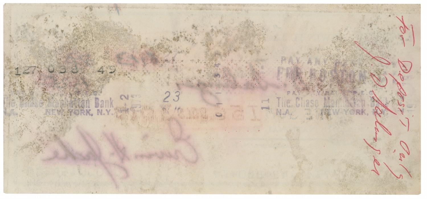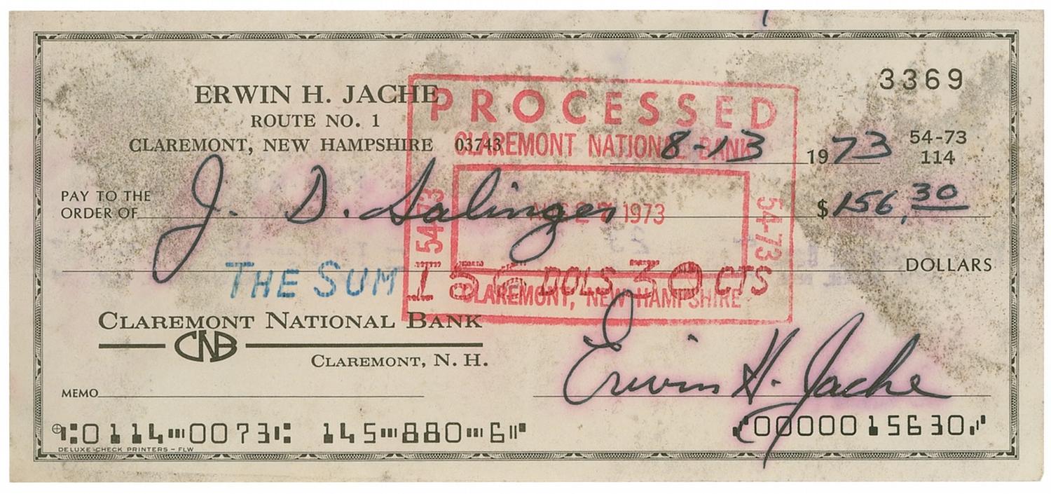 Endorsed check, 6 x 2.75, filled out and signed in another hand, payable to Salinger for $156.30, August 13, 1973. Endorsed on the reverse in red ink, “For Deposit Only, J. D. Salinger.” Light haloing to writing on front of the check, as well as Salinger’s endorsement, expected bank stamps, scattered soiling, and some light rippling from damp staining lightly affecting portions of signature, otherwise very good condition. The check is from a Claremont, New Hampshire woodsman who logged Salinger’s property in the 1970s and paid Salinger for the wood. This is only the second Salinger check we have ever seen.