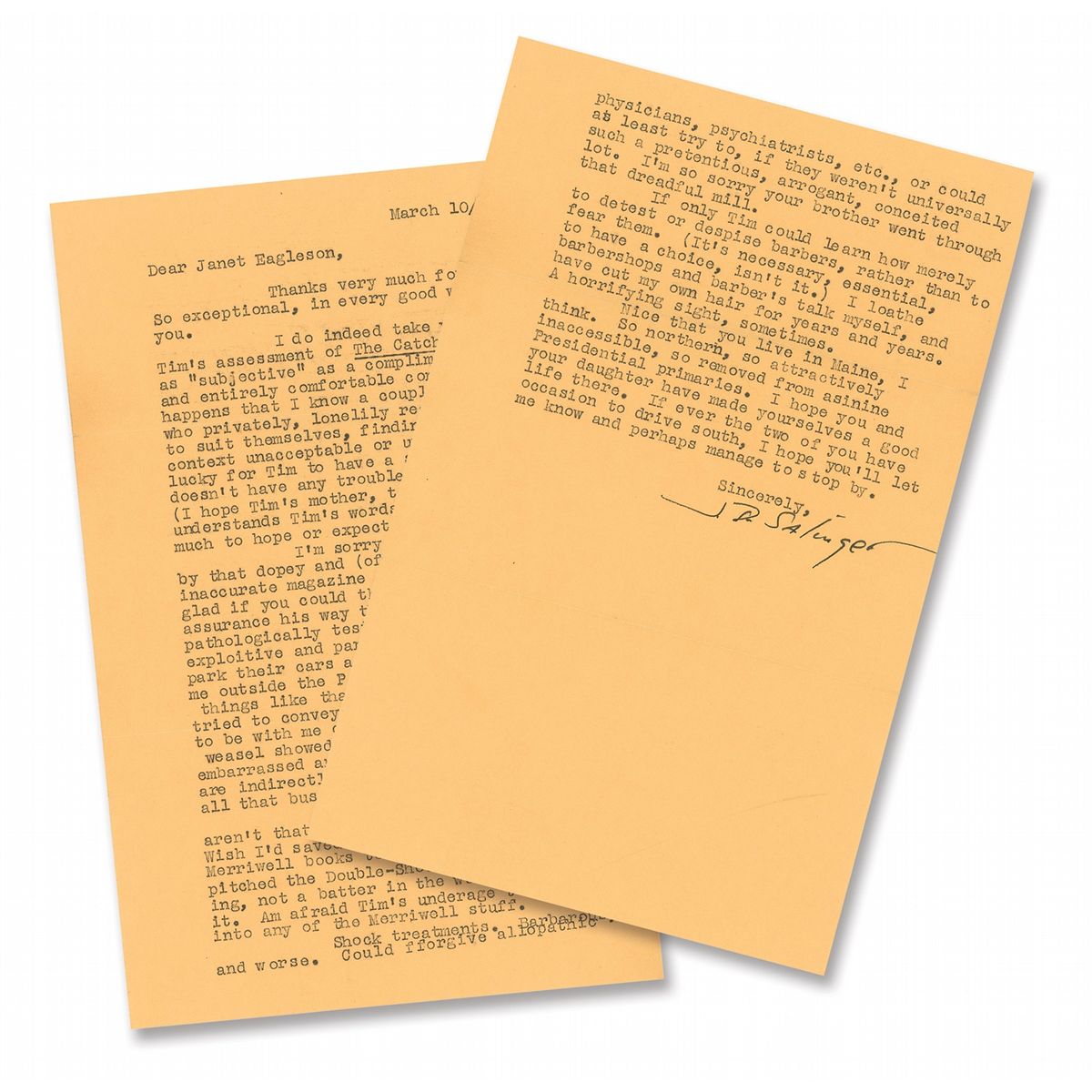 Salinger had moved to “attractively inaccessible” Cornish, New Hampshire in 1953 to escape his unwanted fame. Although he occasionally attended church suppers and was often found shopping in town, he remained aloof even to locals. His hatred of barbershops and the small talk associated with them shows that he even avoided anonymous and casual interactions with the public. As to the press and admirers, he was completely remote: Salinger gave his last interview a few months after this letter. A rare and exceptional personal letter from the enigmatic writer, and the perfect combination of topics: his most famous work and his reclusive lifestyle.
