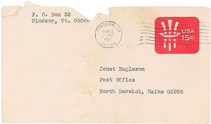 He closes this letter with some kind words about Eagleson’s home state of Maine, and takes a jab at New Hampshire’s first in the country primary, “Nice that you live in Maine, I think. So northern, so attractively inaccessible, so removed from asinine Presidential primaries.” In fine condition. Accompanied by the original mailing envelope.