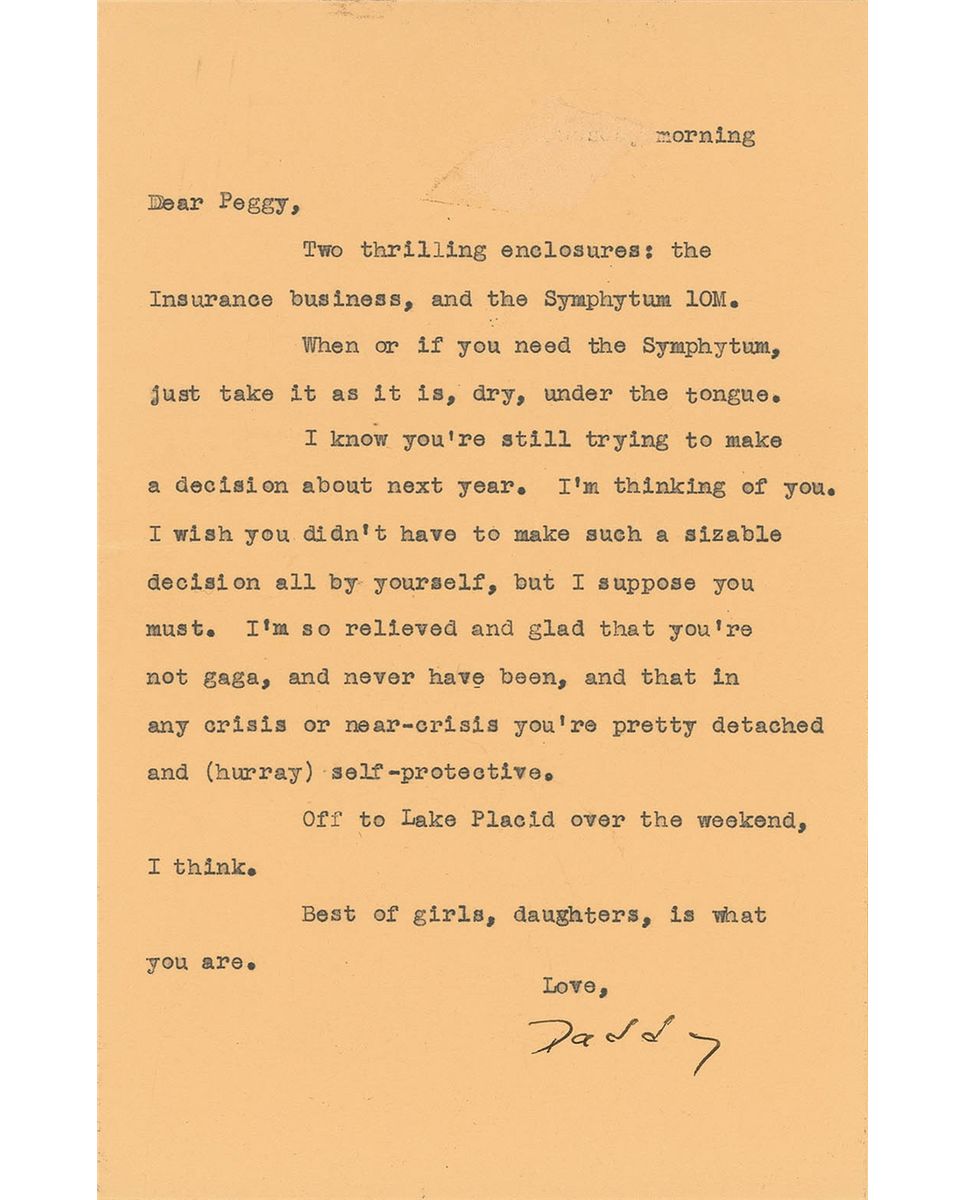 Uncommon TLS signed “Daddy,” one page, 5.5 x 8.5, no date. Letter to his daughter Peggy. In part: “Two thrilling enclosures: the Insurance business, and the Symphytum 10M. When or if you need the Symphytum, just take it as it is, dry, under the tongue. I know you’re still trying to make a decision about next year. I’m thinking of you. I wish you didn’t have to make such a sizable decision all by yourself, but I suppose you must. I’m so relieved and glad that you’re not gaga, and never have been, and that in any crisis or near-crisis you’re pretty detached and (hurray) self-protective.” In very good condition, with a central horizontal fold, paperclip mark to the upper left, and area of surface loss at the top. Despite their strained relationship—Margaret would publish a controversial, critical memoir about her father while he was still living—this letter demonstrates him as a warm, loving man. A choice example of a Salinger letter that showcases his sense of humor and distinct style.