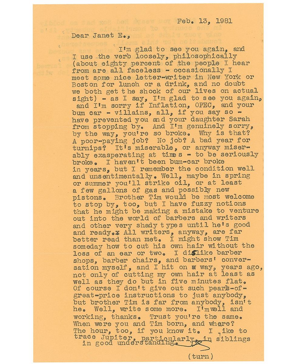 Uncommon TLS signed “JDS,” one page both sides, 5.5 x 8.5, February 13, 1981. Salinger responds to a letter from [Mary] Janet Eagleson (a copy of which is included), a friend and sometime houseguest at his New Hampshire home. In part [Salinger’s spelling,