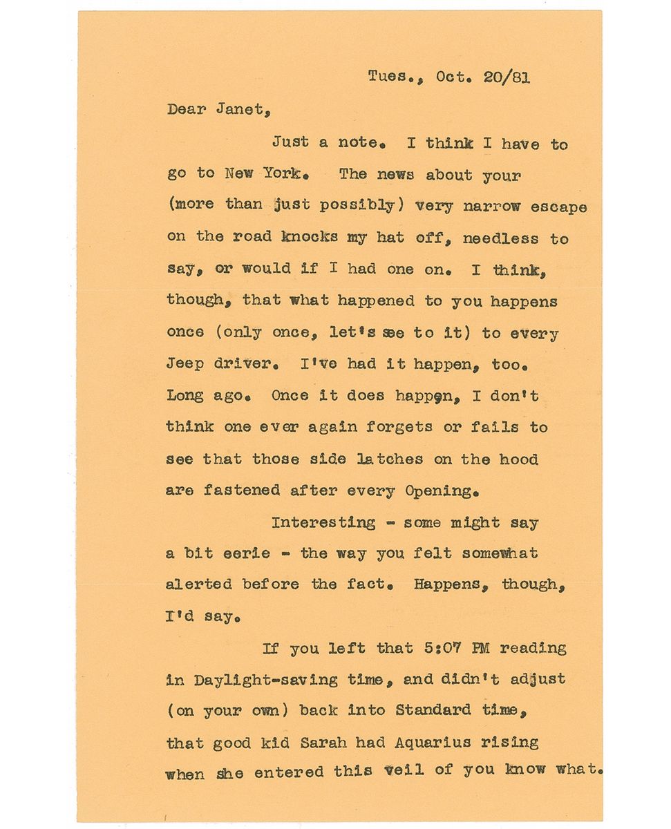 Rare TLS signed “Jerry,” two pages, 5.5 x 8.5, October 20, 1981. The reclusive author responds to a prior message from his longtime pen-pal Mary Janet Eagleson, and waxes on about his family, astrology, philosophy, and even offers an anecdote in response to Eagleson having experienced a “near accident.” It seems that Eagleson informed Salinger that on her way home from a weekend at his house, she was involved in a rather messy happening with the hood of her jeep. In part, Salinger responds [his spellings and capitalizations retained]: “The news about your (more than just possibly) very narrow escape on the road knocks my hat off, needless to say, or would if I had one on. I think, though, that what happened to you happens once (only once, let’s see to it) to every Jeep driver [Eagleson’s hood had flown open]. I’ve had it happen, too. Long ago. Once it does happen, I don’t think one ever again forgets or fails to see that those side latches on the hood are fastened after every Opening. Interesting—some might say a bit eerie—the way you felt somewhat alerted before the fact. Happens, though, I’d say. If you left that 5:07 P.M. reading in Daylight-saving time, and didn’t adjust (on your own) back into Standard time, that good kid Sarah had Aquarius rising when she entered this veil of you know what. Moon in Cancer. Nearly everything else in Libra or Virgo. A thinker and a doubter’s chart, largely. Somebody who wants evidence, proof, not promises, not enthusiasms. So it appears at first glance, anyway. Someone who rarely expects to find character or nobility or unselfishness in people. Which seems to [handwritten insertion: me] reasonable enough, smart enough. Many might say too reasonable perhaps, but the longer in the tooth I get, the more I’m in favor of looking at everything as hard and as reasonably as the body and mind can stand…. Son and girlfriend come and gone. Girlfriend brought soup—not bad, either—and seemed very fond and attentive to son, and sort of vice versa. Who knows. The movie projector somehow repaired itself, which is always a big help for social relations in these parts.” Accompanied by the original mailing envelope, as well as a copy of Eagleson’s letter to Salinger, dated October 14, 1981. In fine condition.