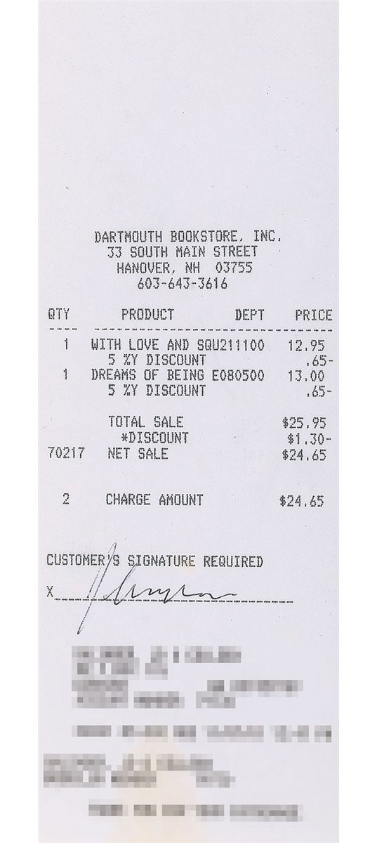 Receipt for a purchase of two books at the Dartmouth Bookstore in Hanover, NH, on November 11, 2001, 2.75 x 7.5, signed in black ballpoint, “J. Salinger.” In fine condition, with an area of slight staining at the bottom.