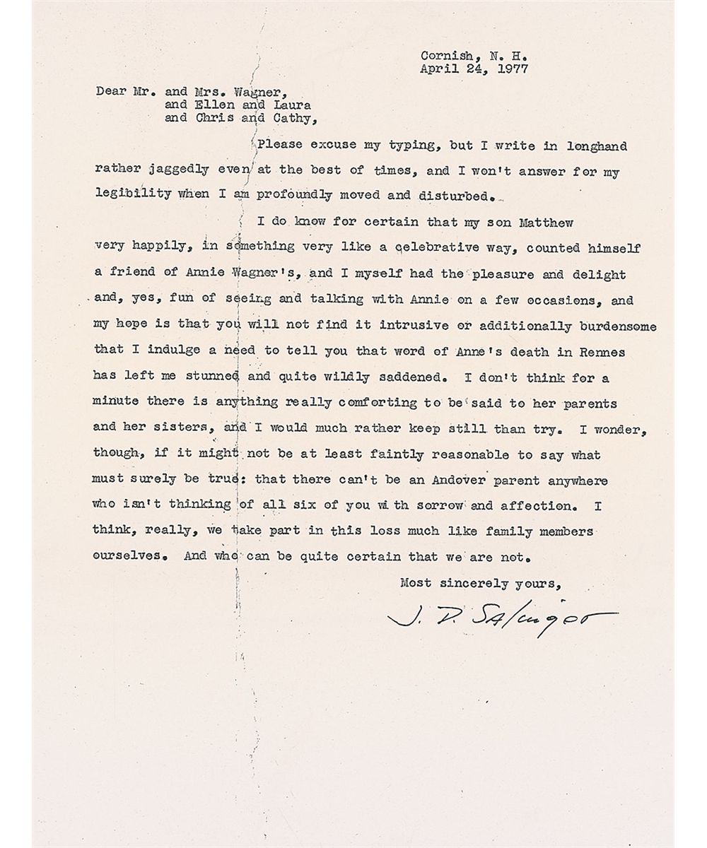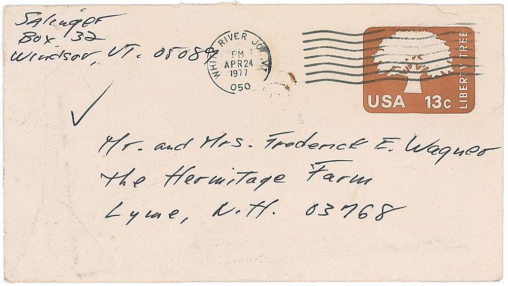 Hand-addressed and -signed envelope, 6.5 x 3.5, postmarked April 24, 1977, addressed by Salinger to “Mr. and Mrs. Frederick E. Wagner, The Hermitage Farm, Lyme, N. H. 03768,” and signed in the return address area, “Salinger, Box 32, Windsor, Vt, 05089.” In fine condition, with some scattered light creases and expected handling wear. Accompanied by a photocopy of the two-page letter which was mailed to the Wagners in this envelope.