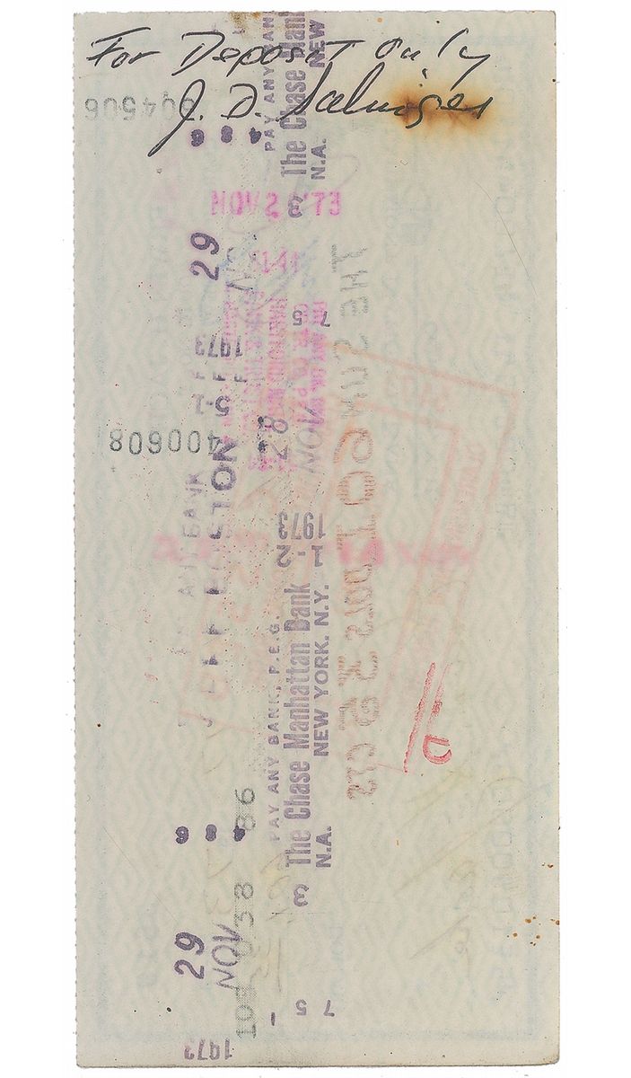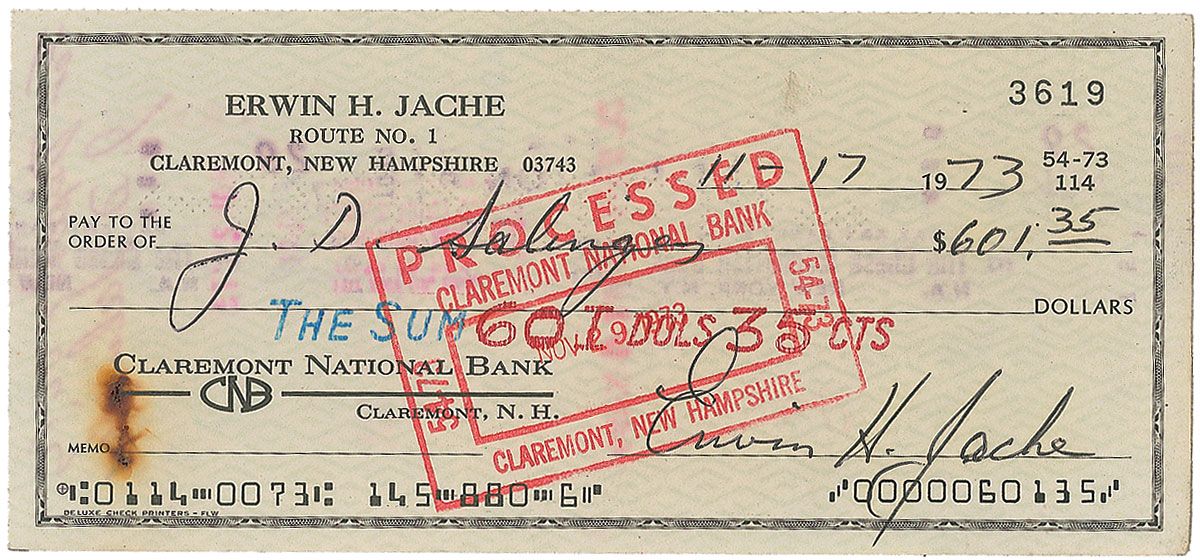 Personal check, 6 x 2.75, filled out and signed by Erwin H. Jache, payable to J. D. Salinger for $601.35, November 17, 1973, endorsed on the reverse by Salinger, “For Deposit Only, J. D. Salinger.” In very good condition, with expected bank stamps and rusty staple holes affecting the end of the signature.