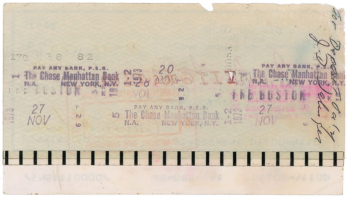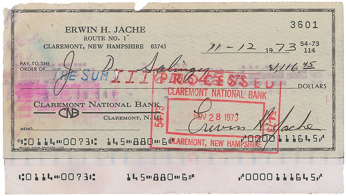 Personal check, 6 x 2.75, filled out and signed by Erwin H. Jache, payable to J. D. Salinger for $1116.45, November 12, 1973, endorsed on the reverse by Salinger, “For Deposit Only, J. D. Salinger.” In very good condition, with scattered creases and a few bank stamps affecting the signature, and a couple small edge tears.