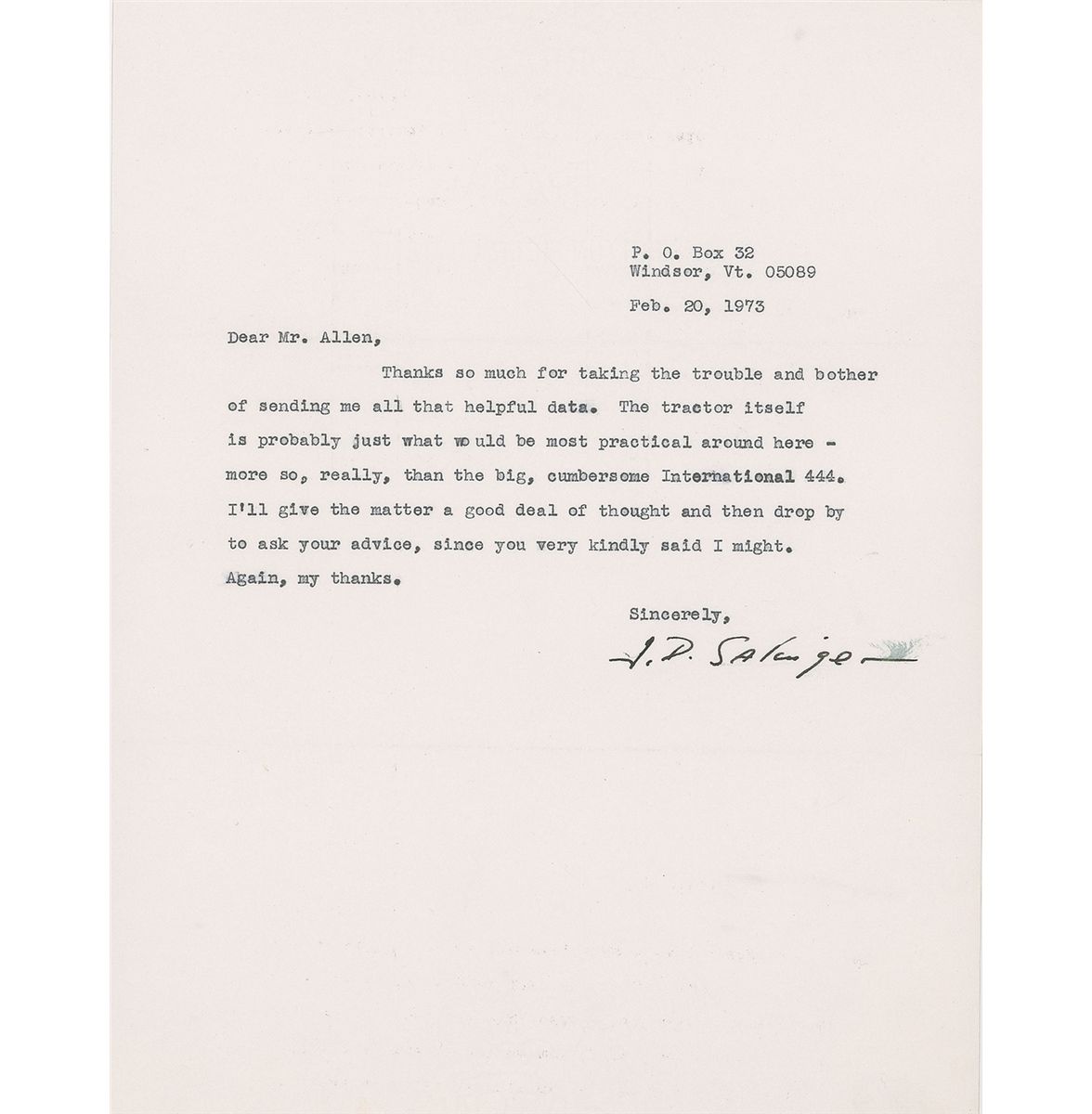 Choice LS, one page, 8.5 x 11, February 20, 1973. Letter to Mr. Allen, in part: “Thanks so much for taking the trouble and bother of sending me all that helpful data. The tractor itself is probably just what would be most practical around here—more so, really, than the big, cumbersome International 444. I’ll give the matter a good deal of thought and then drop by to ask your advice, since you very kindly said I might.” In fine condition, with two tiny areas of paper loss to bottom edge and brushing to a single letter of the last name. Accompanied by the original mailing envelope.