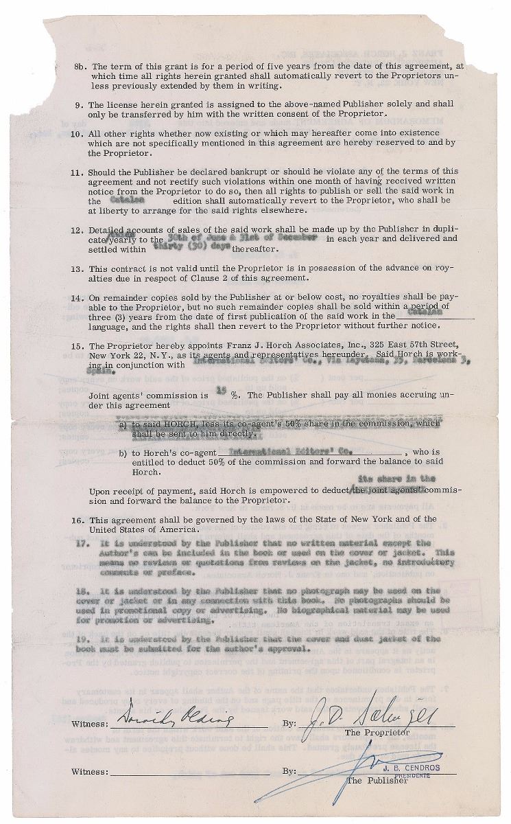 DS, signed “J. D. Salinger,” one page both sides, 8.5 x 14, February 25, 1964. Agreement between Salinger and the publisher Ediciones AT of Barcelona regarding “the work by J. D. Salinger entitled: Franny and Zooey,” in which the author grants the “sole and exclusive license to translate, print, publish and sell the said work in volume form only in a regular trade edition in the Catalan language.” Especially interesting are the additional terms added at the end of the standard form which reflect Salinger’s demands for privacy: “It is understood by the Publisher that no photographs may be used on the cover or jacket or in any connection with the book. No photographs should be used in promotional copy or advertising. No biographical material may be used for promotion or advertising.” Expected document wear, small edge separations at folds, and paper loss to upper corners (not affecting any text), otherwise fine condition.
