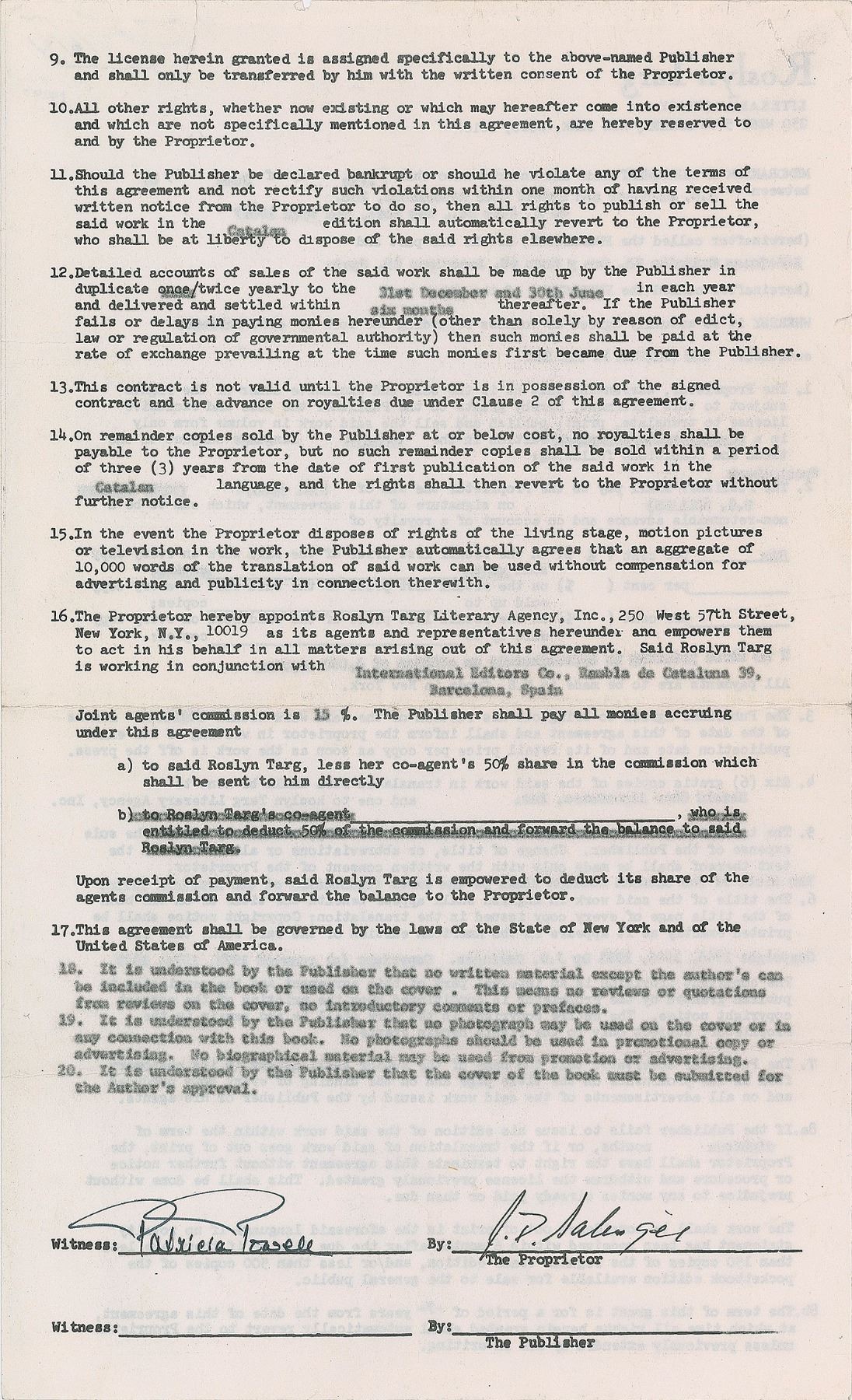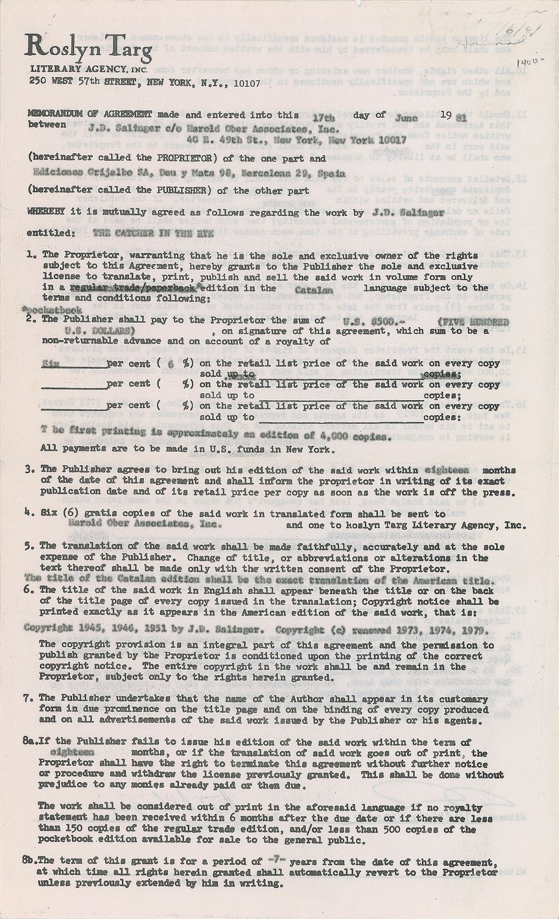 Desirable DS, one page both sides, 8.5 x 14, June 17, 1981. Memorandum of agreement between Salinger and Ediciones Grijalbo SA, in which the former grants "to the Publisher the sole and exclusive license to translate, print, publish and sell" the work entitled The Catcher in the Rye "in volume form only in an edition in the Catalan language" for royalties and an advance sum of $500, with an initial printing of approximately 4,000 copies. Signed at the conclusion in black ink by Salinger. In fine condition, with a tear to the top edge and expected document wear. The Catcher in the Rye remains one of the most beloved and best-selling novels of all time, and has sold in excess of 65 million copies since its publication in 1951. Despite its problematic use of slang, the story of Holden Caulfield has been translated into nearly all of the world's major languages. Salinger remains exceedingly rare in document form.