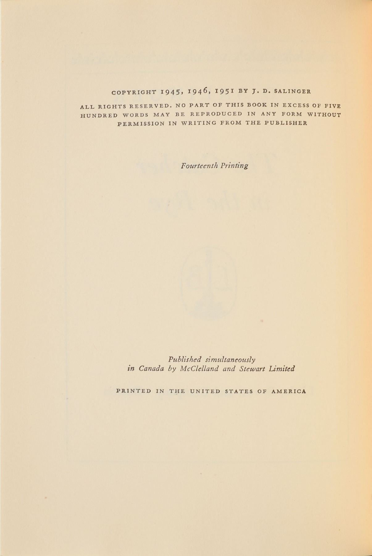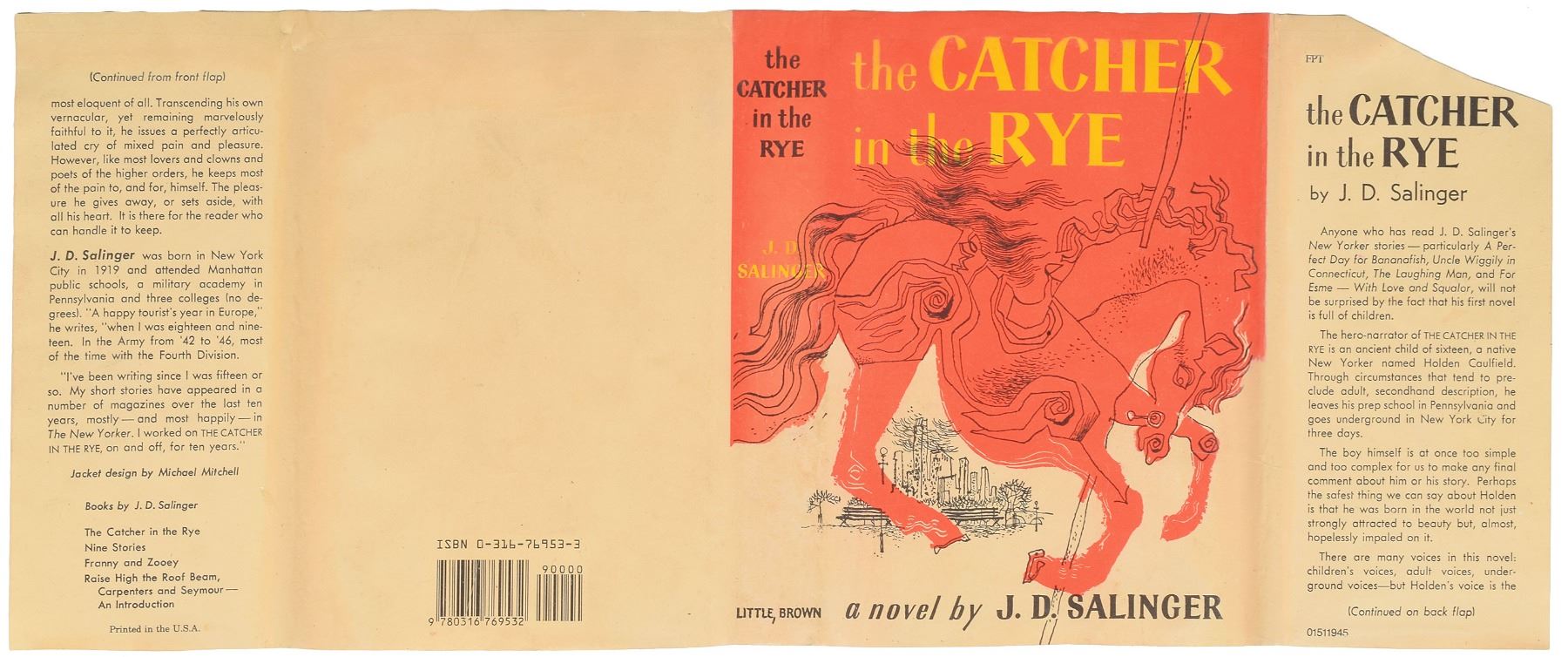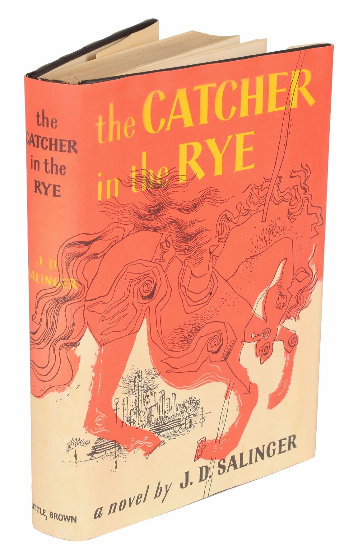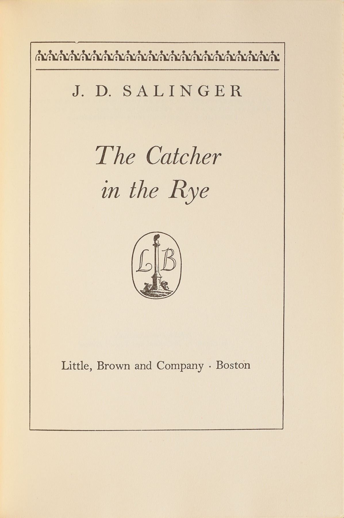 Signed book: The Catcher in the Rye. Fourteenth printing. Boston, Mass.: Little, Brown and Company, 1951. Hardcover with later issue dust jacket (price clipped), 5.75 x 8, 277 pages. Signed and inscribed on the first free end page in black ink, "To Pearl Bsharah, with best wishes from, J. D. Salinger, The New Yorker, April 13, 1959." Autographic condition: fine. Book condition: VG/VG. Accompanied by a custom-made clamshell case. From 1946 to 1965, Salinger published thirteen stories in The New Yorker, including such classics as 'A Perfect Day for Bananafish' and 'Raise High the Roof Beam, Carpenters.' Salinger remains rare across all formats, and signed copies of his most enduring novel remain exceedingly rare and are thus highly sought-after, with only a scarce few known to exist. This example is the first we have offered.
