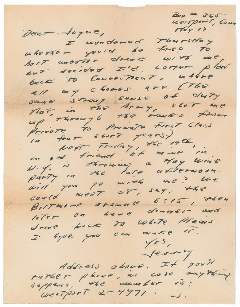 ALS signed “Jerry,” one page, 8.5 x 11, May 13, 1950. Letter to Joyce Miller, in full: "I wondered Thursday whether you'd be free to boit another drink with me, but decided I'd better plod back to Connecticut, where all my chores are. (the same strong sense of duty, that, in the Army, shot me up through the ranks from private to private first class in four short years.) Next Friday, the 19th, an old friend of mine in N.Y. is throwing a May Wine party in the late afternoon. Will you go with me? We could meet at, say, the Biltmore around 6:15, then later on have dinner and drive back to White Plains. I hope you can make it." Salinger adds his initial "J" at the end of a brief postscript: "Address above. If you'd rather phone, in case anything happens, the number is: Westport 2–4771." In fine condition, with some splitting along the intersecting folds. Accompanied by the original mailing envelope, addressed in Salinger's own hand. The recipient, Joyce Miller, was a staffer at The New Yorker in the late 1940s and ’50s, when Salinger was publishing stories in the magazine. At the time of this letter, Salinger was residing in Westport, Connecticut, placing the finishing touches on his classic bildungsroman, The Catcher in the Rye, which was published the following year by Little, Brown and Company. Salinger remains scarce across all formats, with this handwritten letter representing only the second we have ever offered.