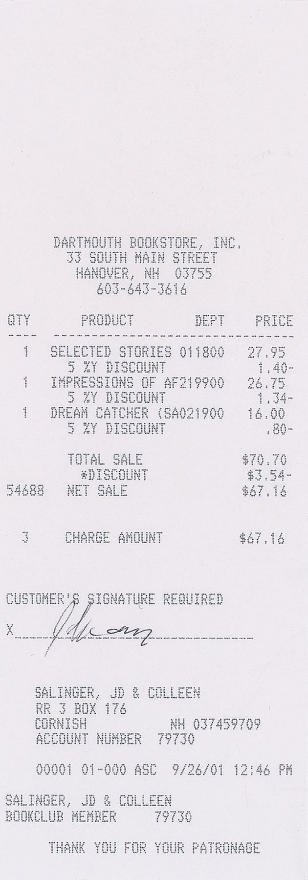 Receipt for a purchase of three books from the Dartmouth Bookstore in Hanover, NH, on September 26, 2001, 2.75 x 7.75, signed quickly in black ballpoint, "J. Salinger." Partial titles are: "Selected Stories," "Impressions of," and "Dream Catcher." In very fine condition.