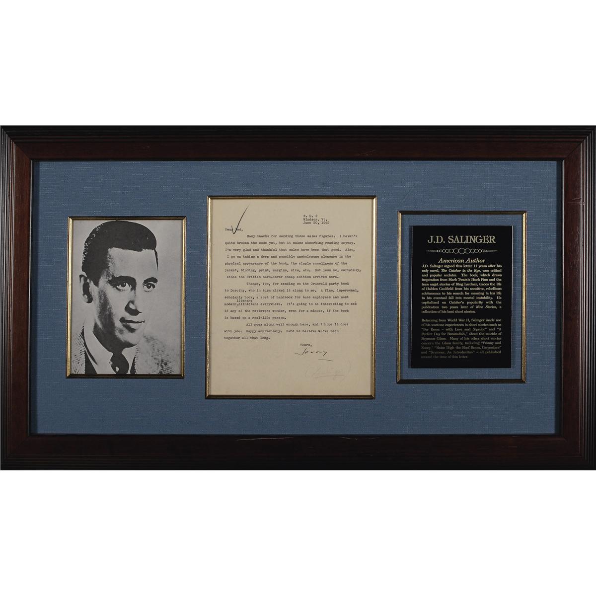 All goes along well enough here, and I hope it does with you. Happy anniversary. Hard to believe we’ve been together all that long.” Nicely cloth matted and framed by Gallery of History, with a biographical plaque and an image of Salinger, to an overall size of 30 x 17.5. In fine condition, with an erased pencil notation under signature and a pencil mark through greeting, Oversized.