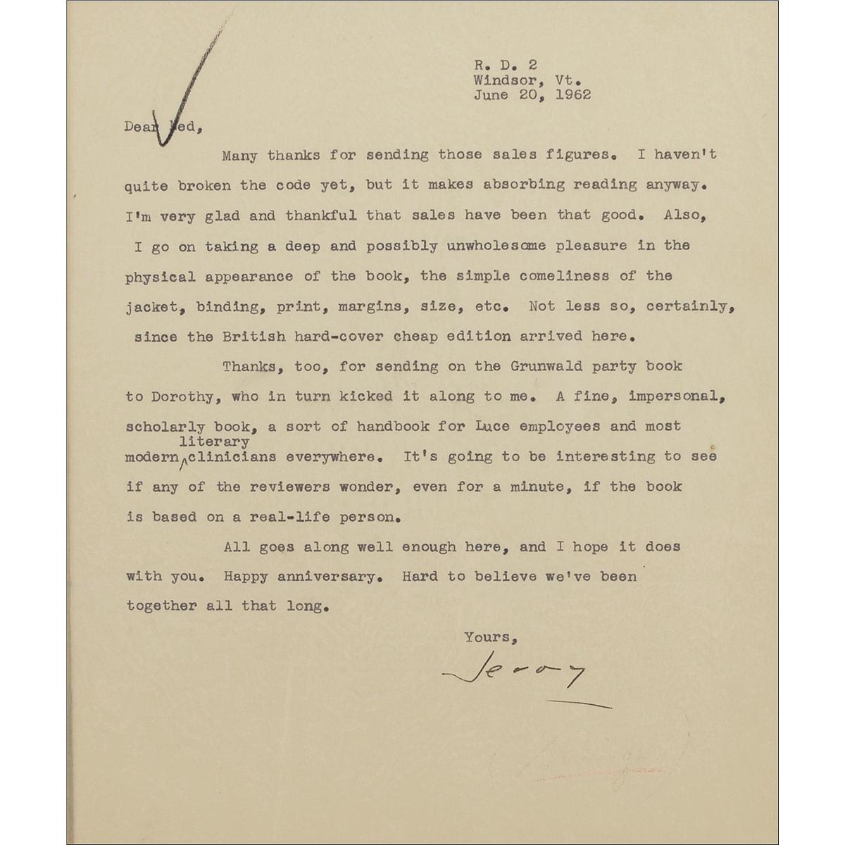 Rare TLS signed “Jerry,” one page, 8 x 10, June 20, 1962. Letter to a literary publisher, concerning Salinger’s appreciation for the publisher having provided him with sales figures he had requested, probably for Franny and Zooey which was published in 1961. In full, “Many thanks for sending those sales figures. I haven’t quite broken the code yet, but it makes absorbing reading anyway. I’m very glad and thankful that sales have been that good. Also, I go on taking a deep and possibly unwholesome pleasure in the physical appearance of the book, the simple comeliness of the jacket, binding, print, margins, size, etc. Not less so, certainly, since the British hard-cover cheap edition arrived here.