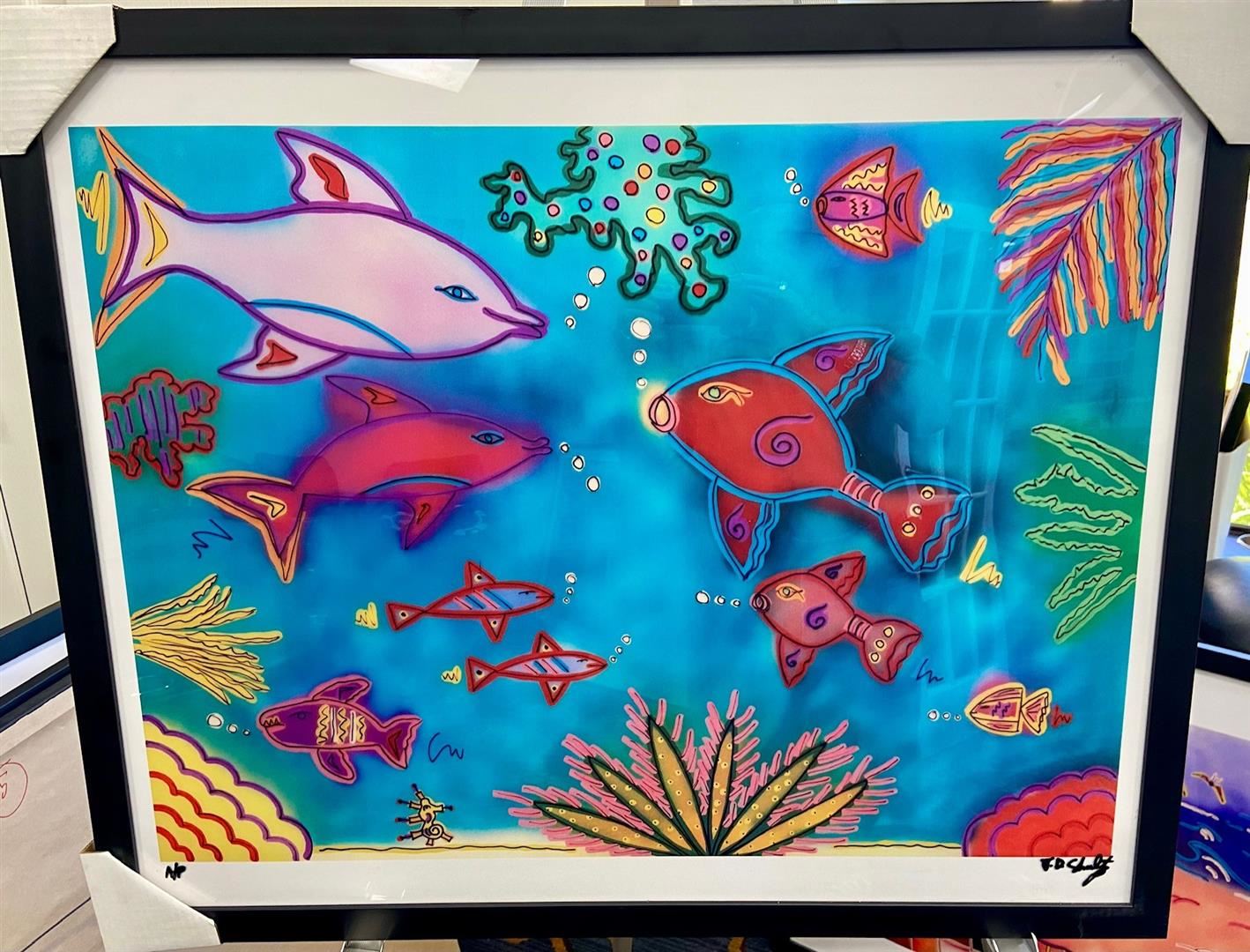 Celebrated artist J.D. Shultz's 28x34" Dolphins & fish. Framed giclee on plexi, signed, numbered AP.