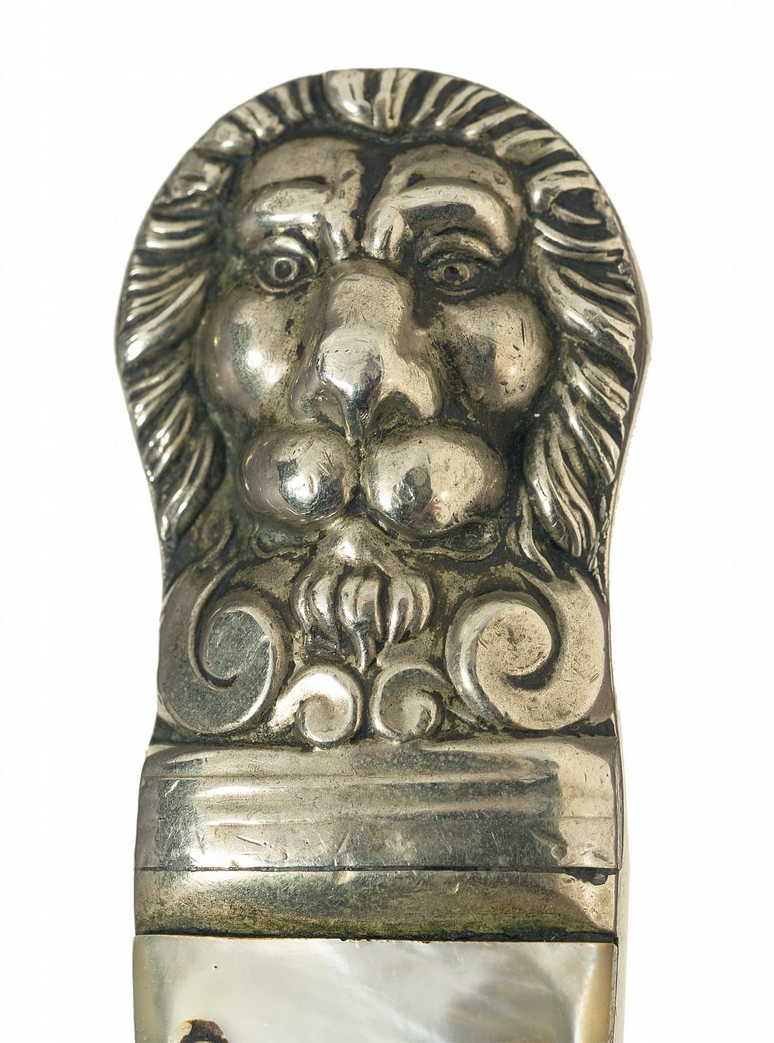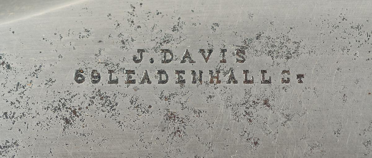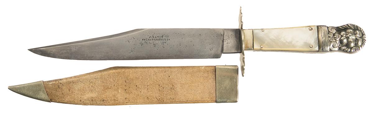 Measuring 7 1/2 inches long, the blade is marked "J. DAVIS/ 69LEADENHALL St." on the left side. Silver handguard, with symmetrical stepped-down quillions. German silver grip, with a pair of pinned smooth mother of pearl grip panels and silver raised lions heads on the pommel. Tan leather sheath, with silver frog stud, throat and tip.