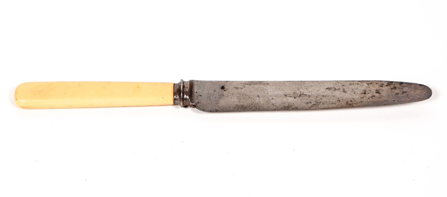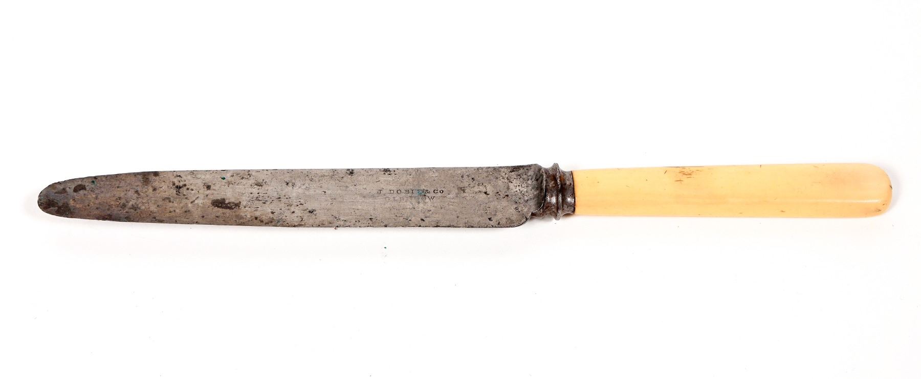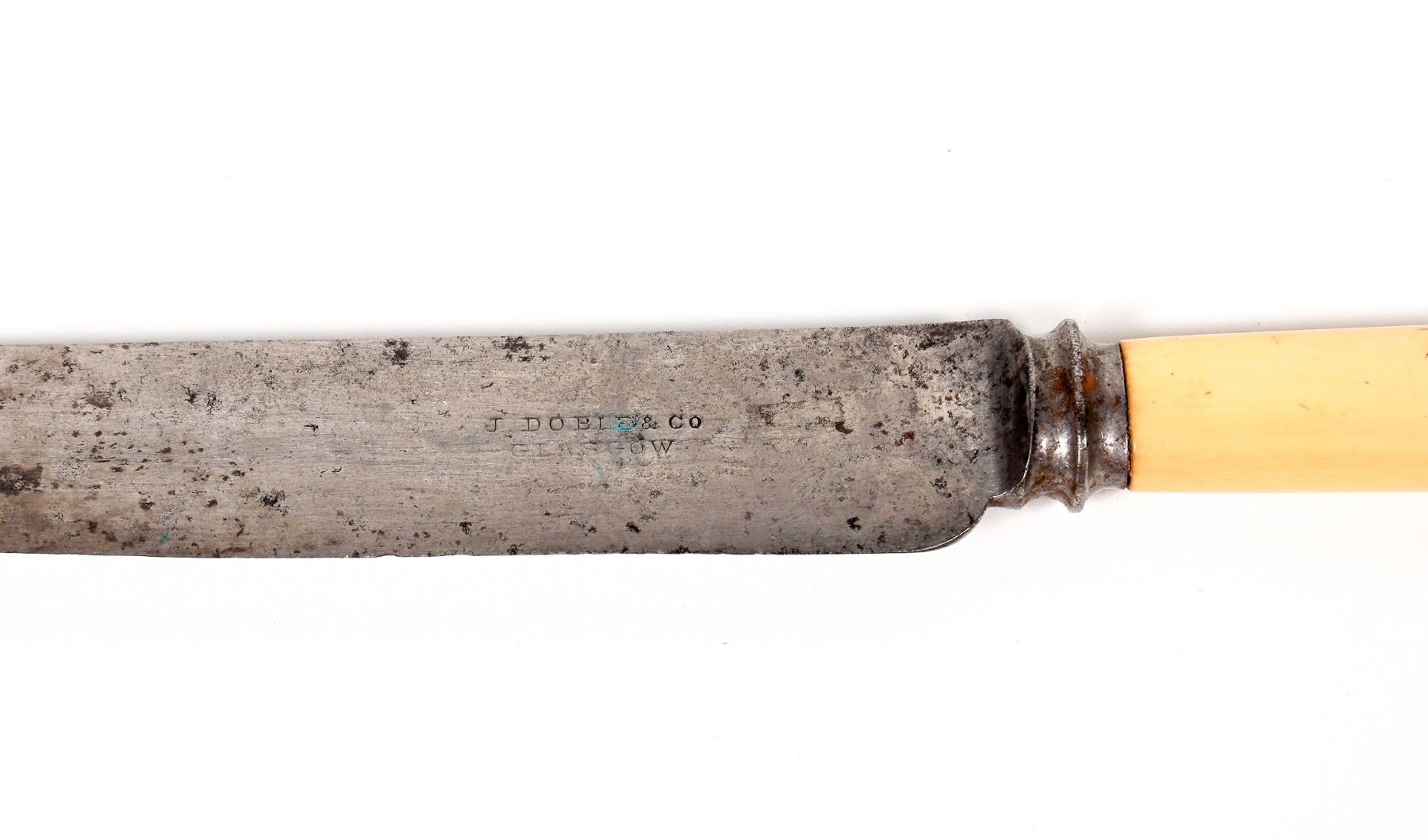 This table knife is marked "J. Dobie & Co./ Glasgow" at 10.5 in. overall length, 6 in. blade and 4 in. cellulose grip. In very good condition. Thought to be Sheffield materials c. 1920's. Please see photos for details.