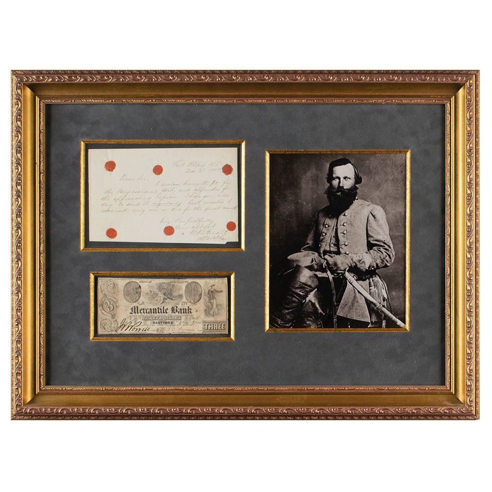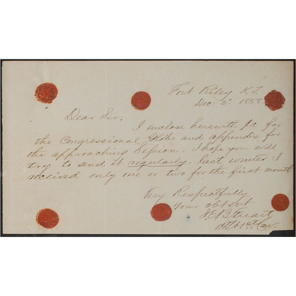 Scarce ALS signed “J. E. B. Stuart, 1st Lt. 1st Cav.,†one page, 7.75 x 5, December 2, 1858. Handwritten letter from "Fort Riley, K.T.," in full: "I enclose herewith $3 for the Congressional Globe and appendix for the approaching Session. I hope you will try to send it regularly, last winter I received only one or two for the first month." Handsomely suede-matted and framed with a portrait and an 1855 three-dollar note from the Mercantile Bank of Hartford to an overall size of 24.75 x 18.5. In fine condition, with a tiny area of thin paper to the left of the signature, and minor loss to the lower right corner. Shortly after graduating from West Point in 1854, Stuart was assigned to the newly formed 1st Cavalry Regiment at Fort Leavenworth, Kansas Territory, where he became regimental quartermaster and commissary officer. He was promoted to first lieutenant in 1855, and relocated to Fort Riley in 1858.