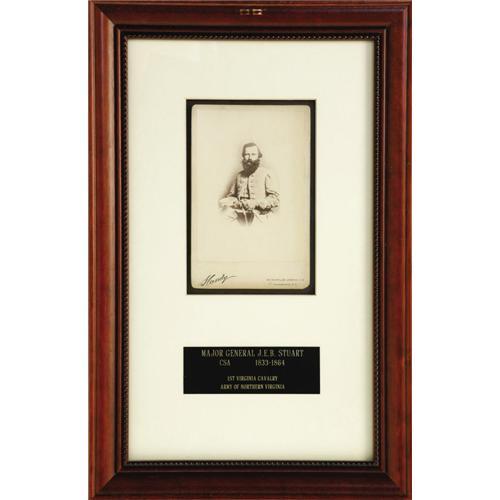 <B>J.E.B. Stuart Cabinet Card.</B></I> 4” x 6” framed and matted with brass descriptive tag under glass to an overall size of 11.25” x 17.25”, Handy, Washington D.C. front imprint, slightly toned at the edges, lower corner chipped, else a fine clear image. A wonderful image of James Ewell Brown Stuart (1833-1864) depicted in uniform with hat on lap and hand on sword. Stuart was killed May 11, 1864 outside of Richmond at Yellow Tavern. The L.C. Handy Studio had been located at 494 Maryland Avenue SW, Washington, D.C. Levin C. Handy was apprenticed at the age of twelve to his uncle, famed Civil War photographer Mathew B. Brady.<BR><BR><b>Shipping:</b> Framed - with Glass, Medium (<a target="_blank" href="http://www.heritageauctions.com/common/shipping.php">view shipping information</a>) <BR><BR><B>Important notice: