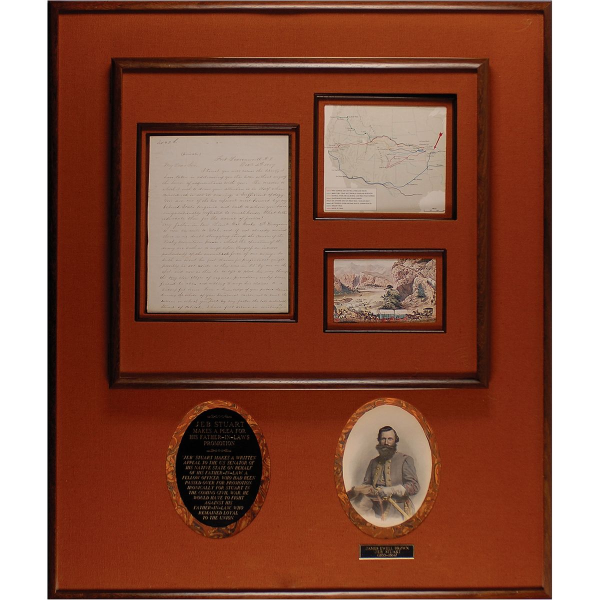 Letter is beautifully double cloth matted and framed, so both sides may be viewed, with a printed map of various trail routes and an image of a wagon train, to an overall size of 21 x 18.5. That frame is in turn affixed by hinges to its left edge to a larger mat and frame, which bears a small plaque, an oval portrait of Stuart, and a transcription of the letter, to an overall size of 28.5 x 34. Intersecting folds, two small tack holes to top edge, a couple of trivial edge tears, some scattered light toning, and a couple of brushes to text, otherwise fine condition.