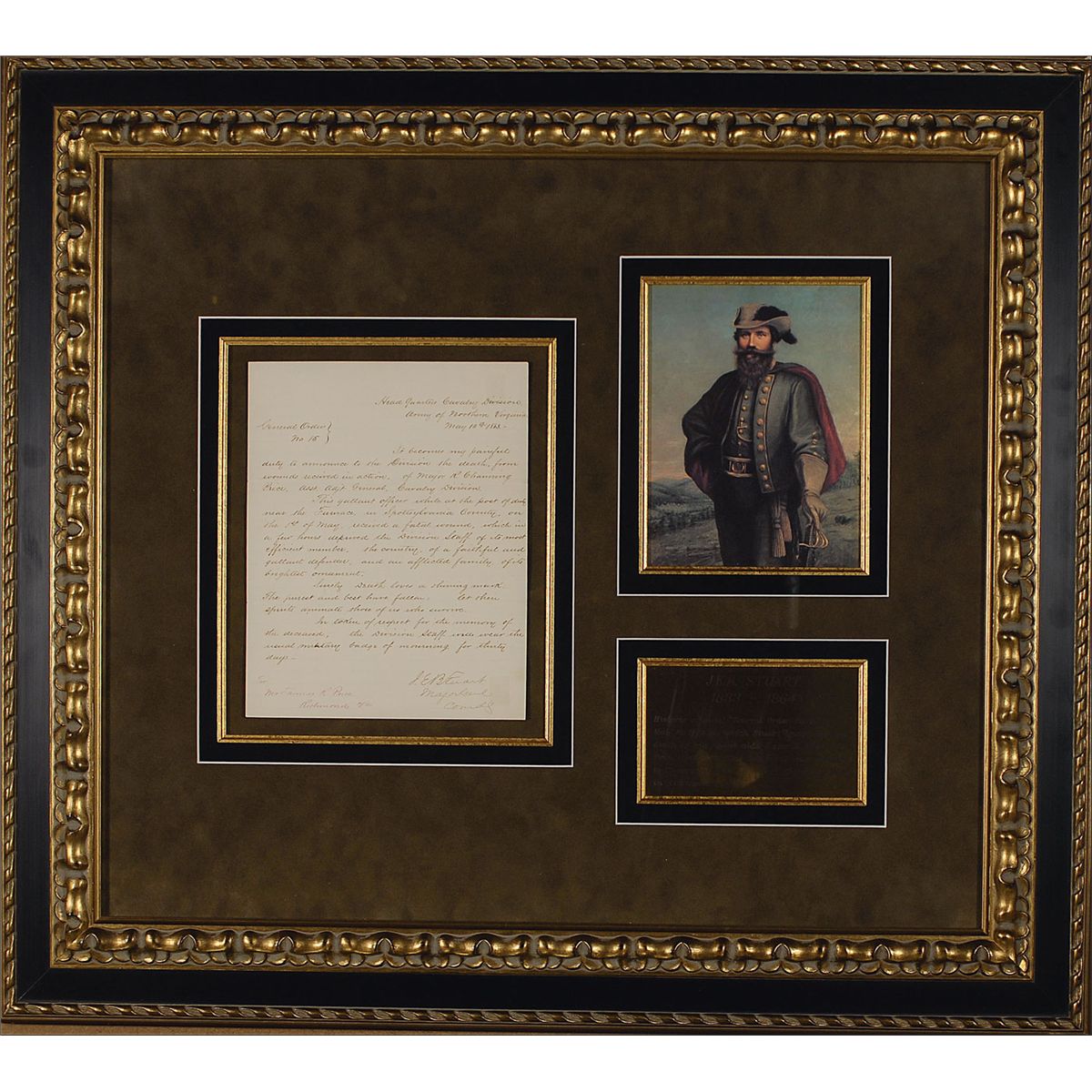 Manuscript DS, signed “J.E.B. Stuart, Major Genl Comdg,” one lightly-lined page, 7.75 x 9.75, May 10, 1863. This General Order No. 15 was written from Cavalry Division Headquarters in Northern Virginia and concerns the death of his right-hand man, Channing Price. In full: “It becomes my painful duty to announce to the Division the death, from wounds received in action, of Major Channing Price, Asst: Adjt: General, Cavalry Division. This gallant officer while at the post of duty near the Furnace, in Spottsylvania County, on the 1st of May, received a fatal wound, which in a few hours deprived the Division staff of its most efficient member, the country, of a faithful and gallant defender, and an afflicted family, of its brightest ornament. Surely Death loves a shining man. The purest and best have fallen: let their spirits animate those of us who survive. In token of respect for the memory of the deceased, the Division Staff will wear the usual military badge of mourning for thirty days.” Beautifully double-suede matted and framed with a color portrait of Stuart, and a descriptive plaque, to an overall size of 30 x 27. In fine, clean condition.