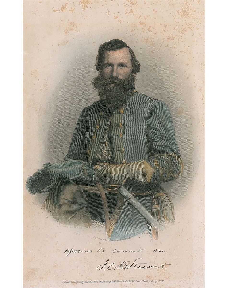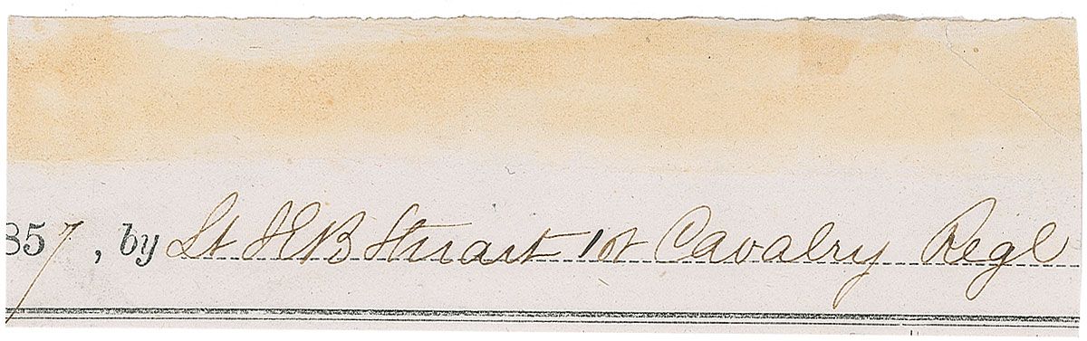 Early ink signature, “Lt. JEB Stuart, 1st Cavalry Regt,” on an off-white 4.25 x 1.25 slip clipped from a 1857 document. Mild toning above signature which could be easily matted out, otherwise fine condition. Accompanied by a color engraved portrait bearing a printed signature. During this time Stuart served as an officer of the newly formed 1st Cavalry stationed at Fort Leavenworth. He would be wounded in July of 1857 by the Cheyenne while fighting at Solomon River.