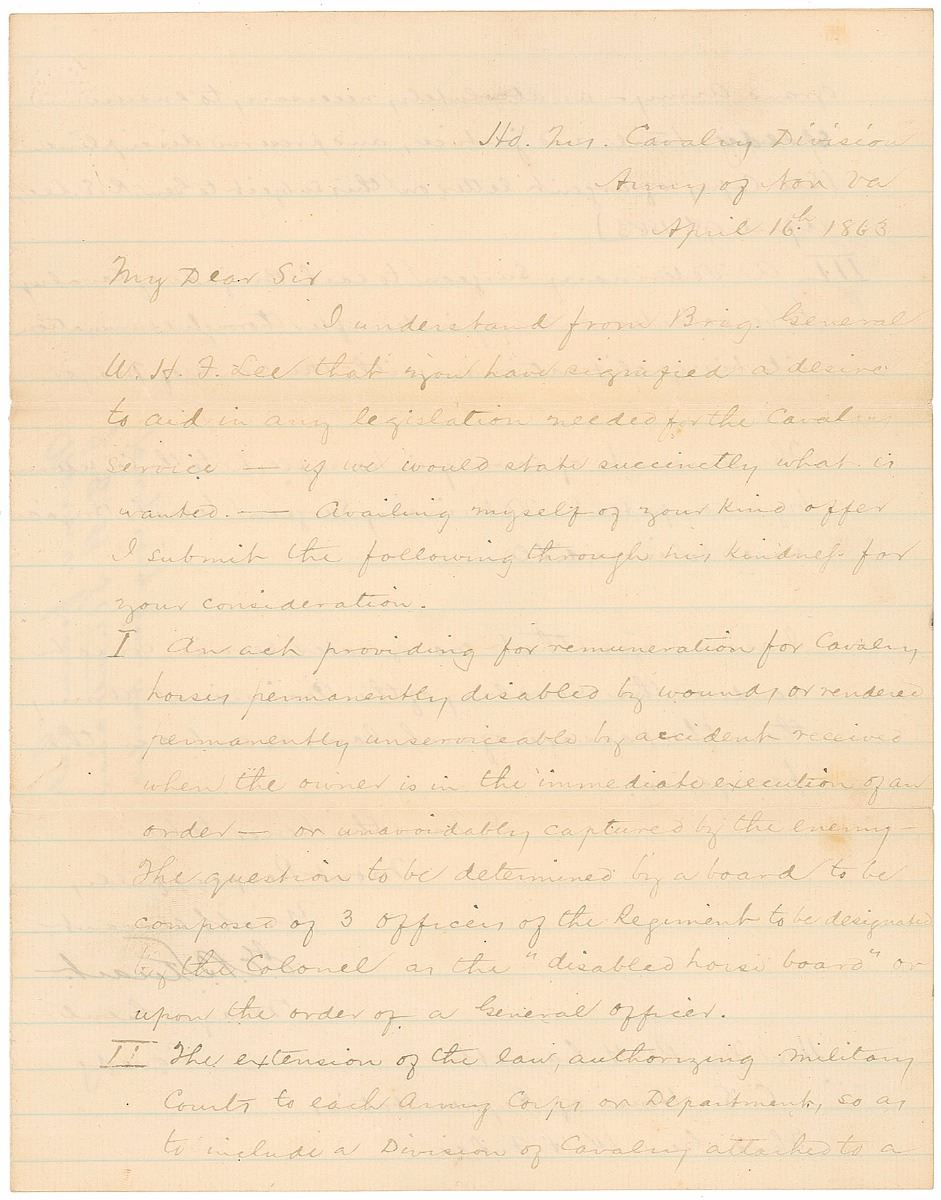 Fabled Confederate general (1833–1864) best known for his consummate skill in reconnaissance and as a cavalry officer. After leading successful offensive actions during the Northern Virginia Campaign—as well as a ‘late,’ disastrous showing at Gettysburg, which led to a personal rebuke by Lee—Stuart was killed during the Overland Camqpaign at the age of 31. LS, one page both sides, 7.75 x 10, April 16, 1863. Letter to the Hon. Muscoe Russell Hunter Garnett, a Virginia Representative to the Confederate States Congress, concerning pending legislation regarding the cavalry and the care of horses, in full: “I understand from Brig. General W. H. F. Lee that you have signified a desire to aid in any legislation needed for the Cavalry service—if we would state succinctly what is wanted. Availing myself of your kind offer I submit the following through his kindness for your consideration. I. An act providing for remuneration for Cavalry horses permanently disabled by wounds or rendered permanently unserviceable by accident received when the owner is in the immediate execution of an order—or unavoidably captured by the enemy. The question to be determined by a board to be composed of 3 officers of the Regiment to be designated by the Colonel as the 'disabled horse board' or upon the order of a General officer. II. The extension of the law, authorizing military courts, to each Army Corps or Department, so as to include a Division of Cavalry attached to a grand army—as absolutely necessary to ensure speedy trial and justice, and preserve discipline. (See copy of urgent letter on this subject to Gen. R. E. Lee, April 9th, 1863). III. A Veterinary Surgeon to each Brigade of Cavalry, to be selected and appointed after thorough examination into his qualifications, with the rank of Major. The amount of saving in horse flesh to the Confederacy by a competent Veterinary Surgeon to each Brigade would be incredible. I assure you that no greater service could be rendered the cavalry of the Provisional Army than the passage of such laws as embrace the foregoing.” In very good condition, with small edge separations at folds, mild soiling, near-complete separation to adjoining fold of blank second integral sheet, and overall writing light but legible; Stuart’s signature is strong and bold.