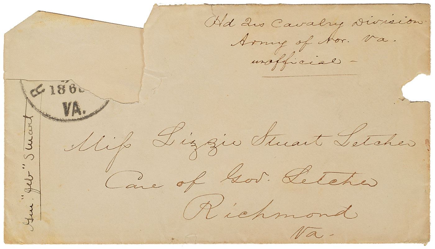 Civil War-dated hand-addressed mailing envelope, 5.5 x 3, addressed by Stuart to his mother, “Miss Lizzie Stuart Letcher, Care of Gov. Letcher, Richmond, Va.," adding to the upper right, "Hd Qrs Cavalry Division, Army of Nor. Va., unofficial—." In very good to fine condition, with paper loss to the right edge and the upper left corner.