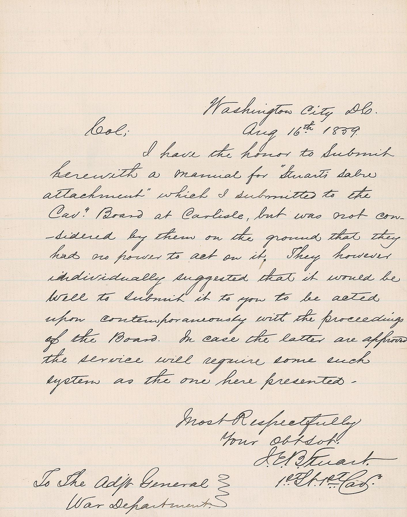 Sought-after ALS signed “J.E.B. Stuart, 1st Lt. 1st Cav.,” one page, 7.75 x 9.75, August 16, 1859. Letter to the Adjutant General of the War Department, in full: "I have the honor to Submit herewith a manual for 'Stuart's Sabre attachment' which I submitted to the Cav'y Board at Carlisle, but was not considered by them on the ground that they had no power to act on it. They however individually suggested that it would be well to submit it to you to be acted upon contemporaneously with the proceedings of the Board. In case the latter are approved the service will require some such system as the one here presented."