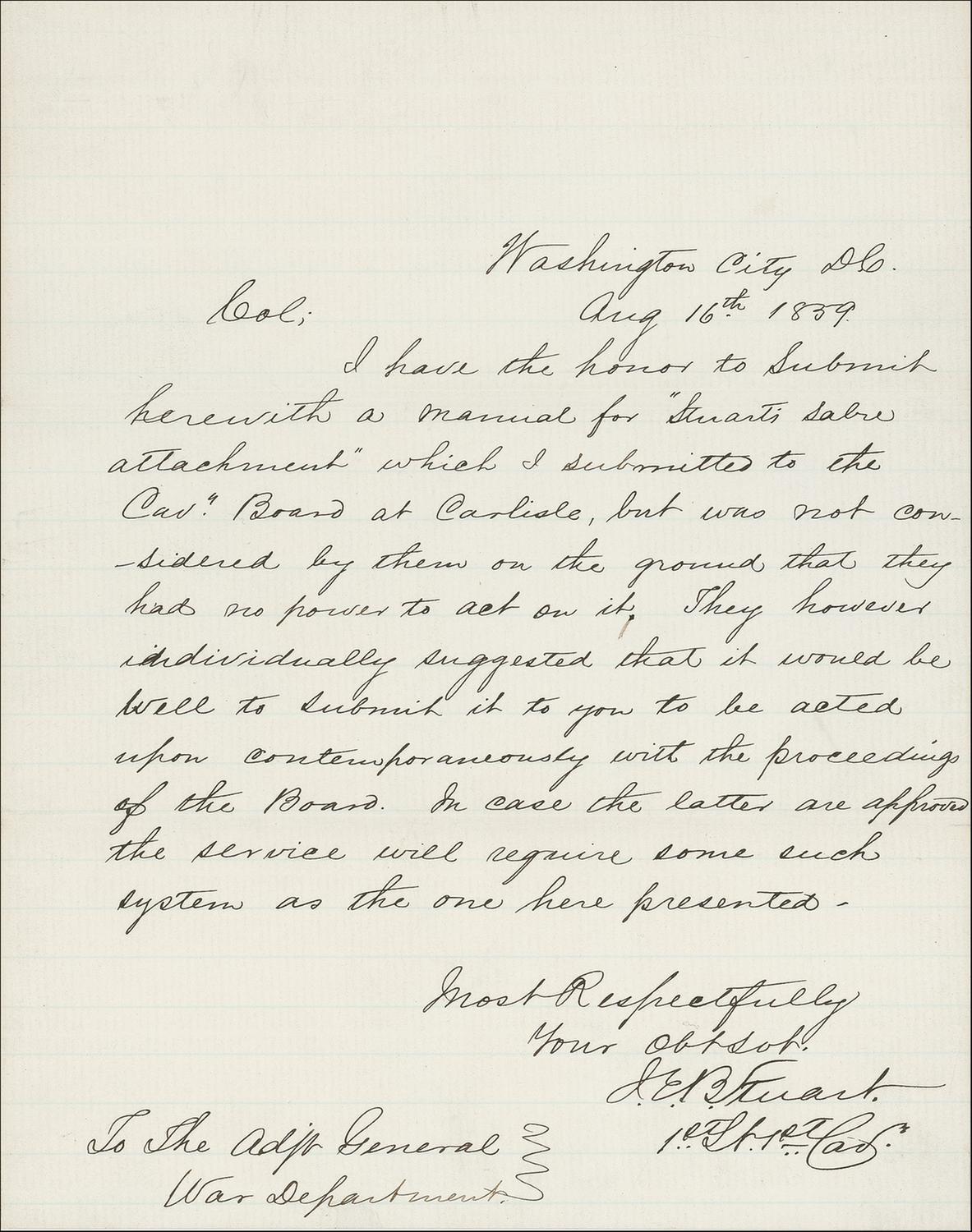 Fabled Confederate general (1833–1864) best known for his consummate skill in reconnaissance and as a cavalry officer. After leading successful offensive actions during the Northern Virginia Campaign—as well as a “late,” disastrous showing at Gettysburg, which led to a personal rebuke by Lee—Stuart was killed during the Overland Campaign at the age of 31. ALS signed “J. E. B. Stuart, 1st Lt. 1st Cav.,” and also signed again in the text, “Stuart,” one lightly lined page, 7.75 x 9.75, August 16, 1859. Stuart writes to the Adjutant General of the War Department. In full: “I have the honor to submit herewith a manual for “Stuart’s Sabre attachment,” which I submitted to the Cavalry Board at Carlisle, but was not considered by them on the ground that they had no power to act on it. They, however, individually suggested that it would be well to submit it to you to be acted upon contemporaneously with the proceedings of the Board. In case the latter are approved the service will require some such system as the one presented.” In very fine and extremely fresh, clean condition. Previously recommended for army adoption by a board of cavalry officers, the War Department purchased the rights to produce the quickly detachable saber attachment, which featured a spring-loaded catch for easy removal of the weapon. Designed by Stuart just before the start of the Civil War, this unique piece of hardware was patented in October 1859. The importance of Stuart’s attachment is often overlooked in military history, but at the time was welcomed by cavalrymen. As most fighting took place dismounted, the saber served little real purpose and actually hampered a soldier’s movement. It was while in Washington to discuss a government contract for this very weapon that Stuart heard of John Brown’s raid at Harpers Ferry, leading the young Army officer to volunteer to join Robert E. Lee in confronting Brown—and undoubtedly bringing his attachment with him.