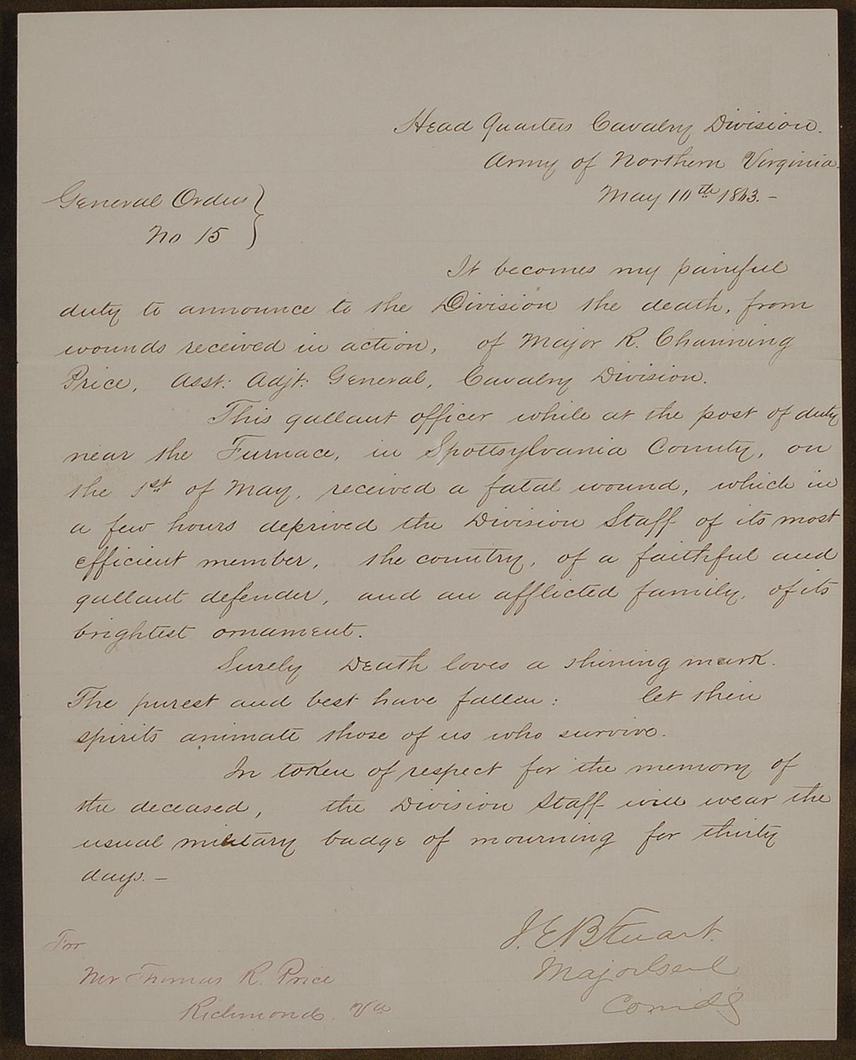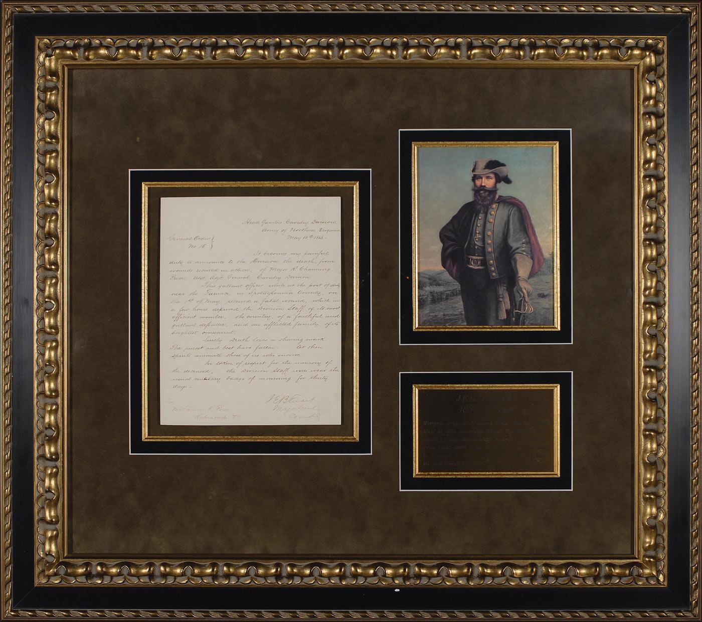 Manuscript DS, signed “J.E.B. Stuart, Major Genl Comdg,” one lightly-lined page, 7.75 x 9.75, May 10, 1863. This General Order No. 15 was written from Cavalry Division Headquarters in Northern Virginia and concerns the death of his right-hand man, Channing Price. In full: “It becomes my painful duty to announce to the Division the death, from wounds received in action, of Major Channing Price, Asst: Adjt: General, Cavalry Division. This gallant officer while at the post of duty near the Furnace, in Spottsylvania County, on the 1st of May, received a fatal wound, which in a few hours deprived the Division staff of its most efficient member, the country, of a faithful and gallant defender, and an afflicted family, of its brightest ornament. Surely Death loves a shining man. The purest and best have fallen: let their spirits animate those of us who survive. In token of respect for the memory of the deceased, the Division Staff will wear the usual military badge of mourning for thirty days.” Beautifully double-suede matted and framed with a color portrait of Stuart, and a descriptive plaque, to an overall size of 30 x 27. In fine, clean condition. R. Channing Price joined the 3rd Virginia Howitzers at the outbreak of the Civil War. On July 29, 1862, he was appointed aide-de-camp to Stuart. Having just turned 20, and serving as a major for only eight weeks, Price was a universally popular young officer of Stuart’s staff. Price’s photographic memory made it possible for Stuart to issue long and intricate orders as they rode side by side, then would dismount and write them out verbatim. Near Catharine Furnace on May 1, a shell fragment hit Price behind the knee. Although bleeding profusely, Price refused medical aid and insisted on staying at Stuart’s side. Price soon fainted from loss of blood and died that evening at the Wellford house a few hundred yards south of where he had been wounded. Oversized.