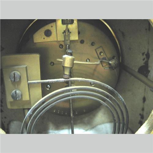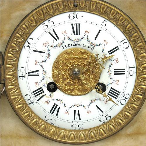 J. E. Caldwell & Co. marble cased clock; dome top with two pair of reeded columns flanking porcelain dial; painted floral swags on dial; impressed on back Japy Freres & Cie Med D'Honneur; late 19th to early 20th C.; 12 1/2" high x 13" across x 5 3/4" deep; no visible defects