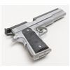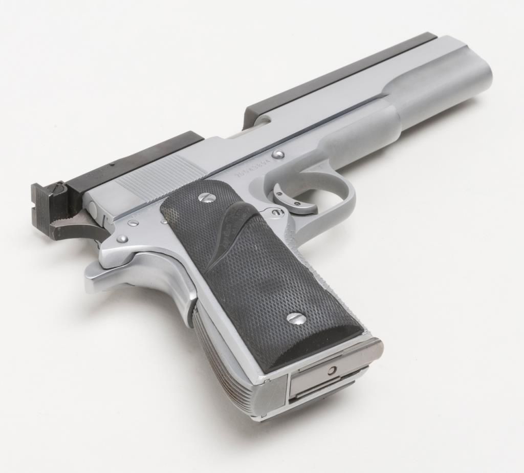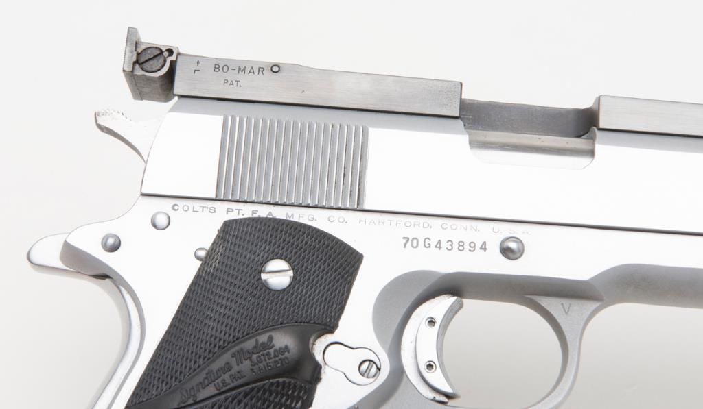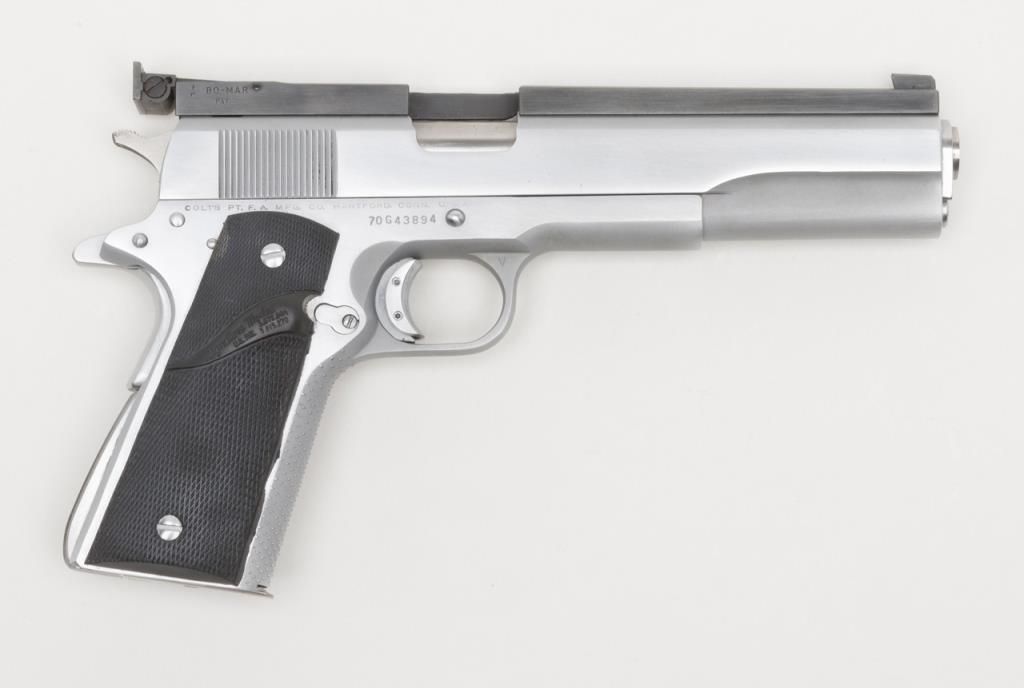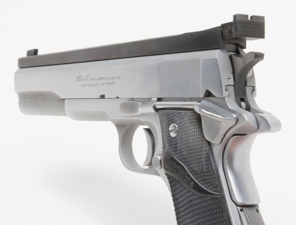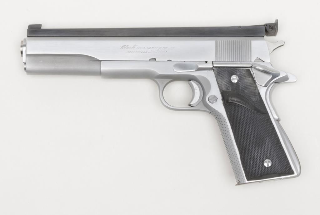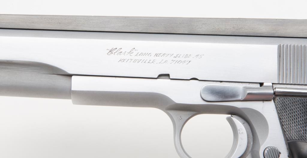 J.E. Clark Custom semi-auto Target pistol constructed from a Colt Government Model, .45 cal., 6” barrel, stainless steel, Pachmayr checkered hard rubber grips, “Clark” long heavy custom slide, #70G43894 in overall fine conditionwith a fine bore, crisp action and very good to fine grips; instructions sheet and specifications from Clark included along with Colt factory Styrofoam box inserts. Special features of gun include: complete accuracy job, complete triggerjob, front strap stippled, deluxe Bo-Mar rear sight installed. (Modern/PPT). Est.: $700-$1,400.
