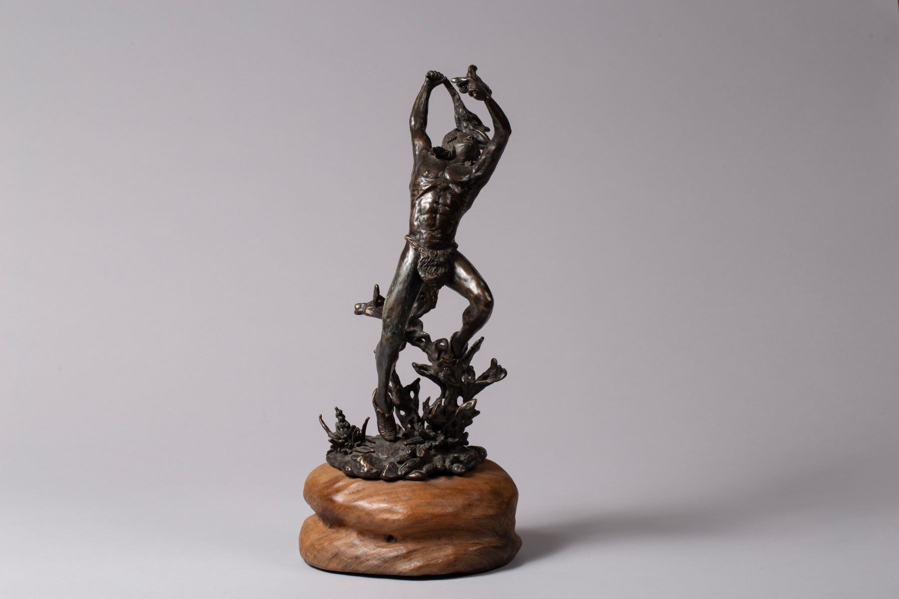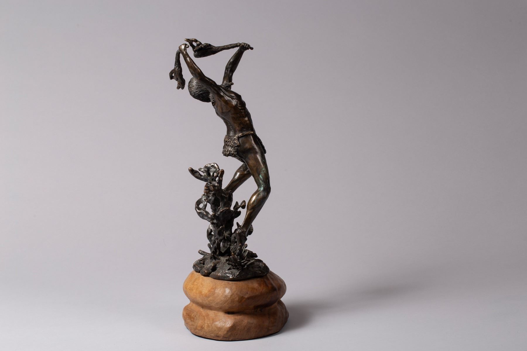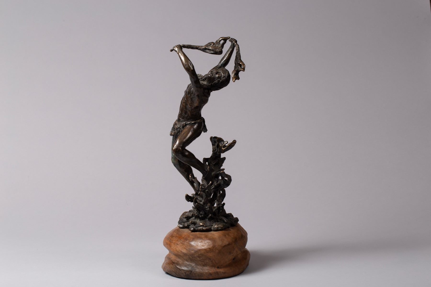 Native American Warrior Dancing with Fire Sculpted in Bronze on a nicely carved wooden base; Marked 1 of 1; Ca 1983