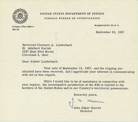 1895 - 1972) Controversial Director of the F.B.I. who built the organization into the world's finest investigative agency. T.L.S. "J.E. Hoover" 1p., 8vo. on Federal Bureau of Investigation letterhead, Sept. 20, 1957, Washington. To a Reverend Clarance A. Liederbach, in part: "...Your note of September 12, 1957, and the clipping you attached have been recieved, and I appreciate your interest in communicating with me in this regard...". Very good.