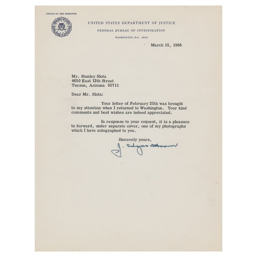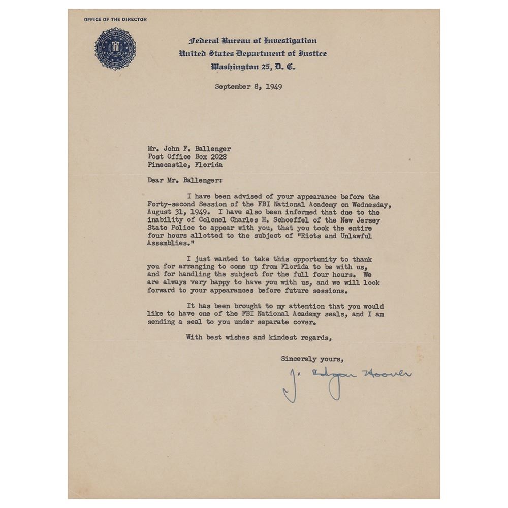 Two TLSs, each one page, FBI letterhead, dated 1949 and 1966. The first, to John F. Ballenger, dated September 8, 1949, in part: "I have been advised of your appearance before the Forty-second Session of the FBI National Academy…I have also been informed that due to the inability of Colonel Charles H. Schoeffel of the New Jersey State Police to appear with you, that you took that entire four hours allotted to the subject of 'Riots and Unlawful Assemblies.' I just wanted to thank you for arranging to come up from Florida to be with us." The second, to Stanley Slota, dated March 15, 1966, in part: "Your kind comments and best wishes are indeed appreciated. In response to your request, it is a pleasure to forward, under separate cover, one of my photographs which I have autographed for you." In fine condition.