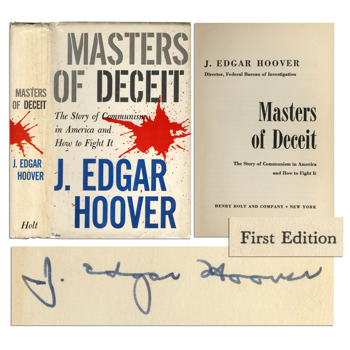 J. Edgar Hoover signed first edition of ''Masters of Deceit,'' published by Henry Holt and Company: New York: 1958. The FBI Director inscribes, ''To G. Shelby Ferguson / Best wishes / J. Edgar Hoover / 7.8.58'' upon the front free endpaper. In this important 1950's treatise on communism, Hoover outlines five types of ''fellow travelers,'' from the ''card-carrying Communist'' to the ''dupe,'' who inadvertently enables communism. Minor toning to signature page and chipping to unclipped dustjacket. Both in very good condition.